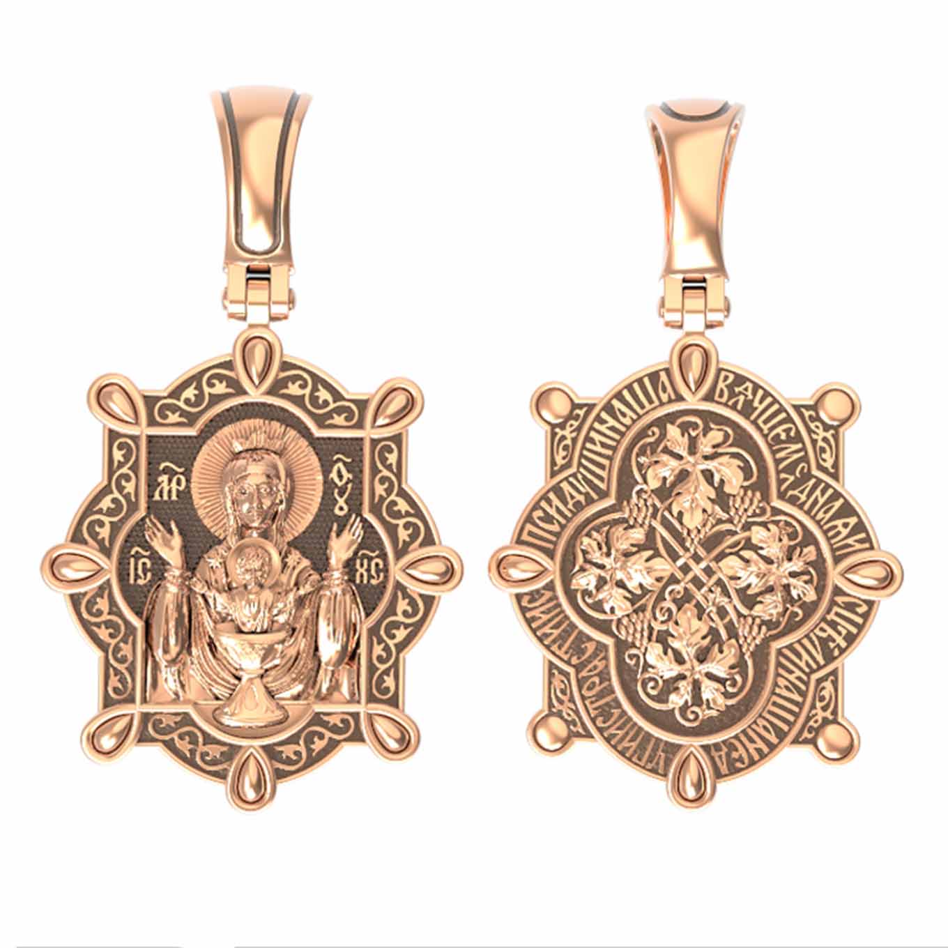 На лицевой части образка изображена икона Божией Матери «Неупиваемая чаша». Икона славится помощью в исцелении зависимостей, помогает людям обрести свободу от греховных страстей.