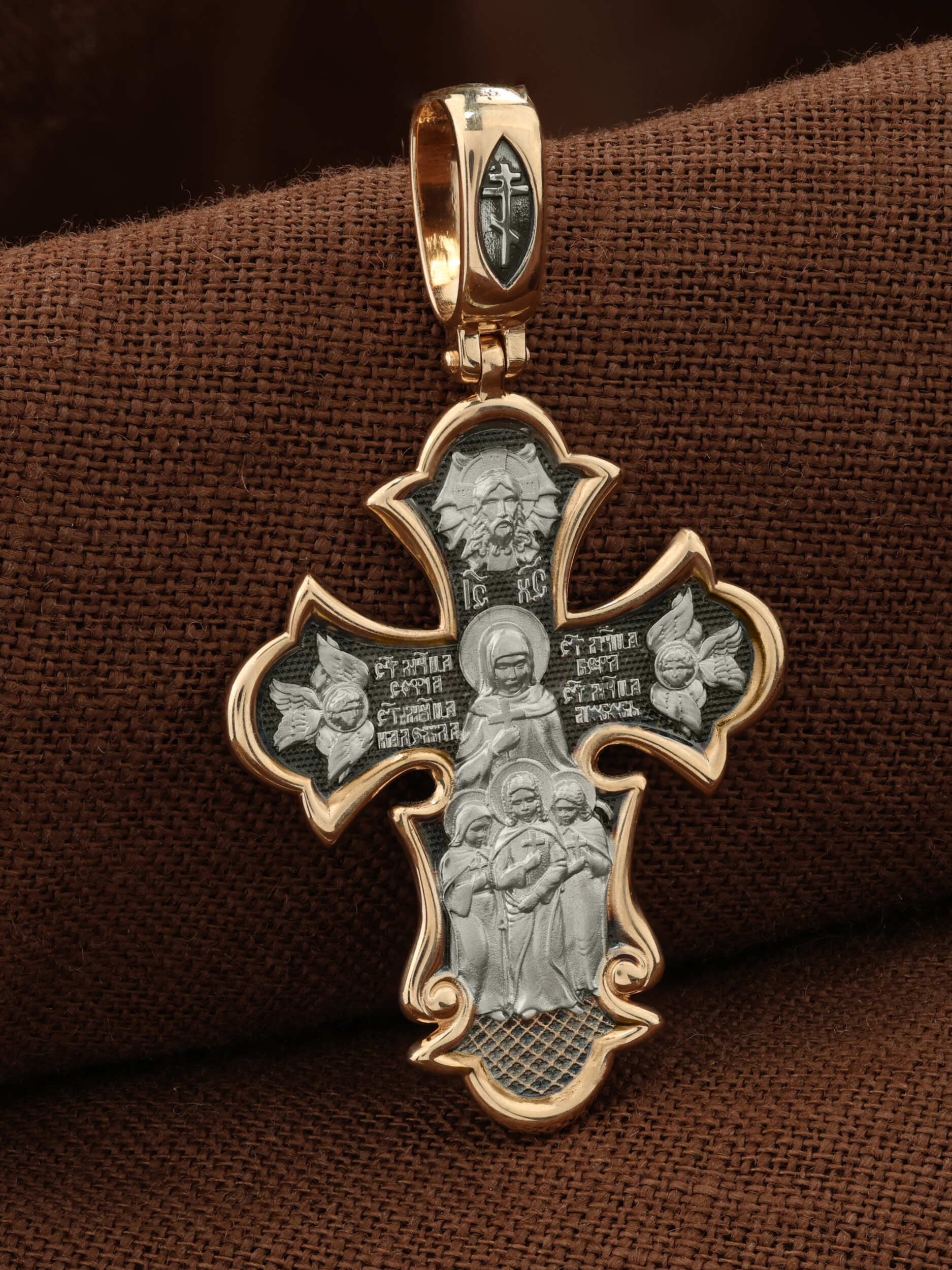 На оборотной стороне креста изображены Святые мученицы Вера, Надежда, Любовь и матерь их София, жившие во 2 веке нашей эры в Римской империи. Известно, что София была родом из Милана. Она рано овдовела, после чего перебралась в Рим. Своих дочерей София воспитывала в христианской вере и даже дала им имена в честь главных христианских добродетелей — Вера, Надежда и Любовь. В те годы римское государство жестоко преследовало верующих во Христа. Маленьких девочек (старшей Вере тогда было всего 12, а младшей Любови лишь 9) арестовали, подвергли истязаниям, а затем умертвили на глазах их матери. Сама София скончалась на следующий день у могилы своих дочерей. Но трагическая судьба на земле обернулась для мучениц вечной славой в ином мире. Церковь причислила их к лику святых и сегодня по молитвам к ним происходят чудеса. Выше образов мучениц изображен Спас Нерукотворный — образ Господа и Спасителя нашего Иисуса Христа, чудесно отпечатавшийся на плате, котором Христос вытер свой лик. По обеим сторонам креста изображены Ангелы Серафимы. На кулонном кольце помещен крест.