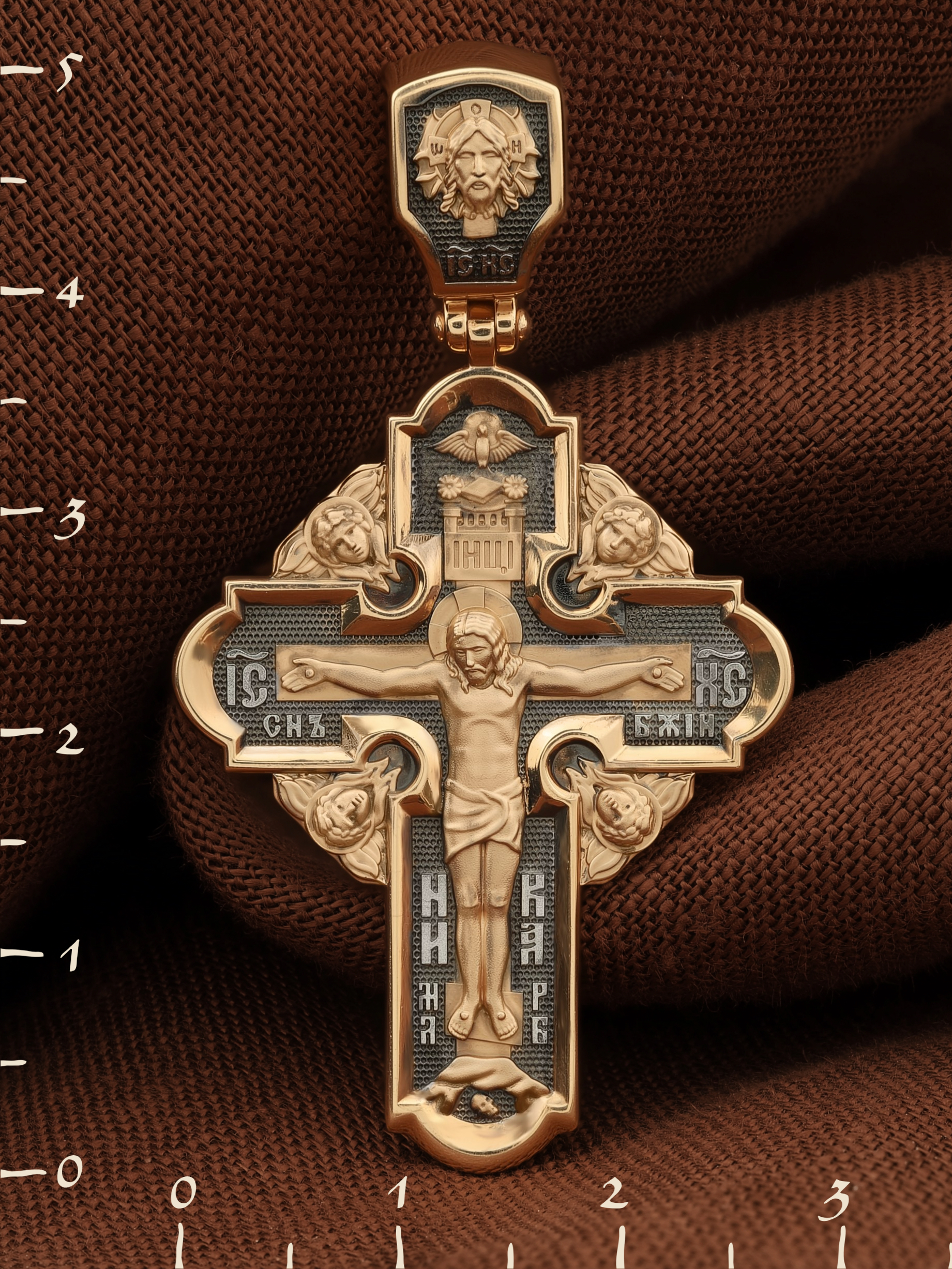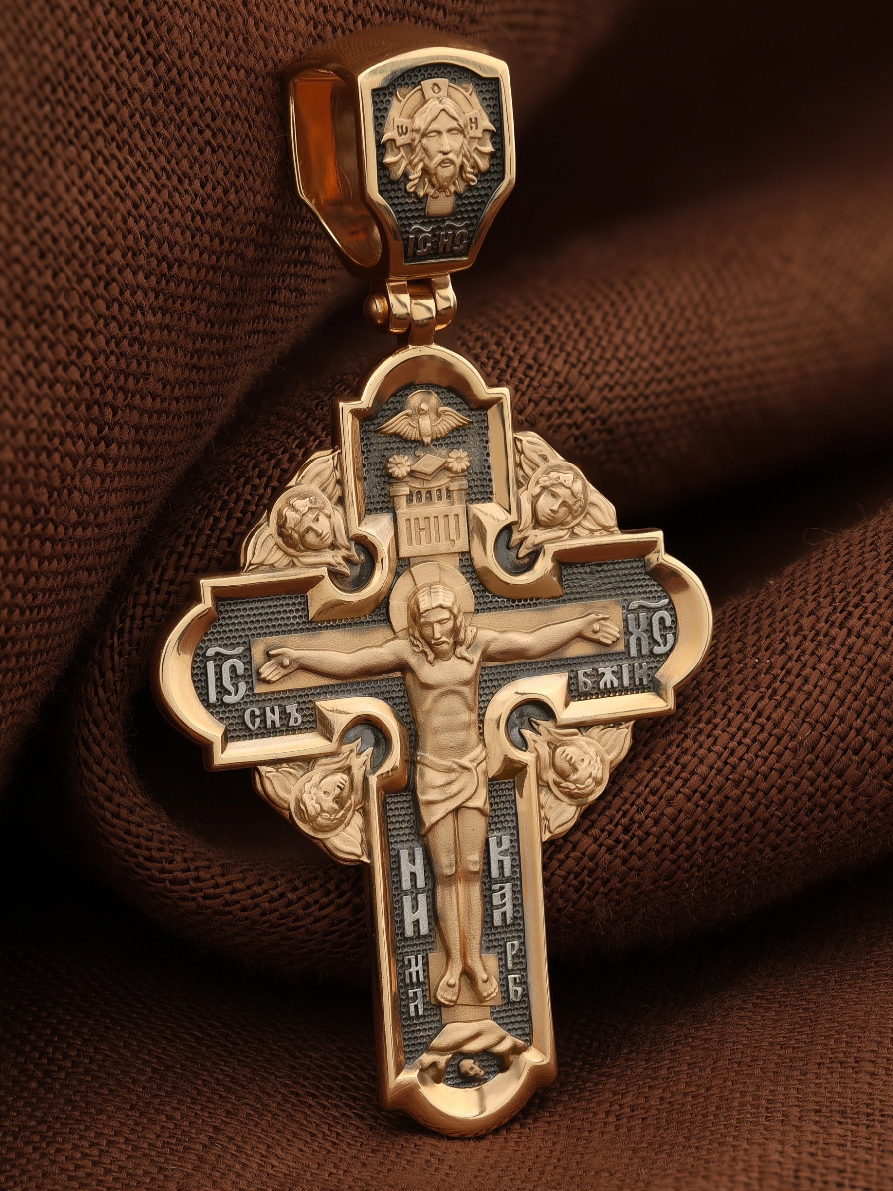 На лицевой стороне креста изображено Распятие Господа и Спасителя нашего Иисуса Христа. Крест- символ спасения и искупления рода человеческого, знамение победы над смертью и адом. Верхняя перекладина символизирует титло — табличку, на которой, согласно Евангелию, было начертано: Иисус Назорей Царь Иудейский (IНЦI). Надпись «IC» «ХC», означает Иисус Христос, помещается на разных сторонах поперечной перекладины креста. Ниже перекладины расположено словосочетание «СЫН БОЖИЙ», что означает божественную природу Иисуса Христа. Надпись «МЛРБ» — «место лобное рай бысть» означает, что место лобное стало раем и помещаются в нижней части креста. Рядом — слово «НИКА», что означает «победитель». Возвышение, на котором стоит Крест, символизирует гору Голгофу, на которой произошло Распятие. Под подножием Креста изображена покоящаяся голова (череп) Адама. На кулонном кольце изображен Нерукотворный образ Господа и Спасителя нашего Иисуса Христа, чудесно отпечатавшийся на плате, которым Христос вытер свой лик.
