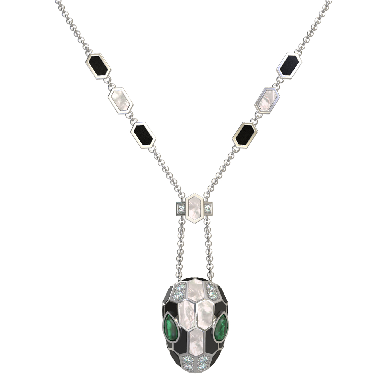 Колье из белого золота c бриллиантами, рубином, ониксом, малахитом и перламутром
