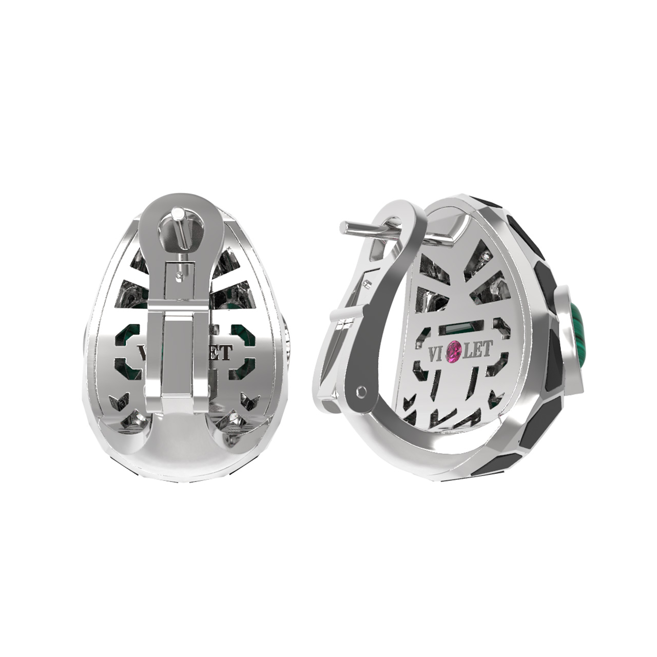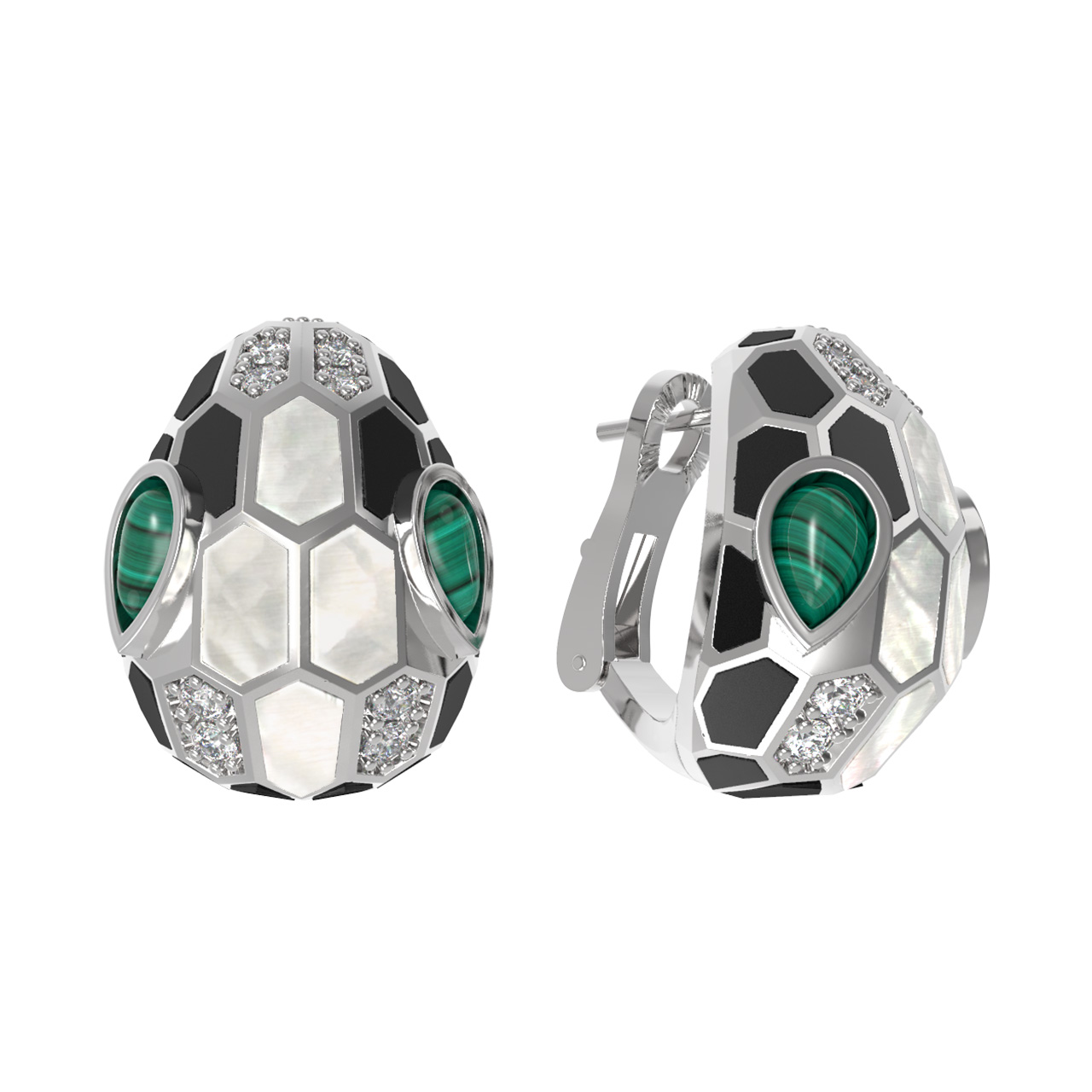 Серьги из белого золота c бриллиантами, рубином, ониксом, малахитом и перламутром