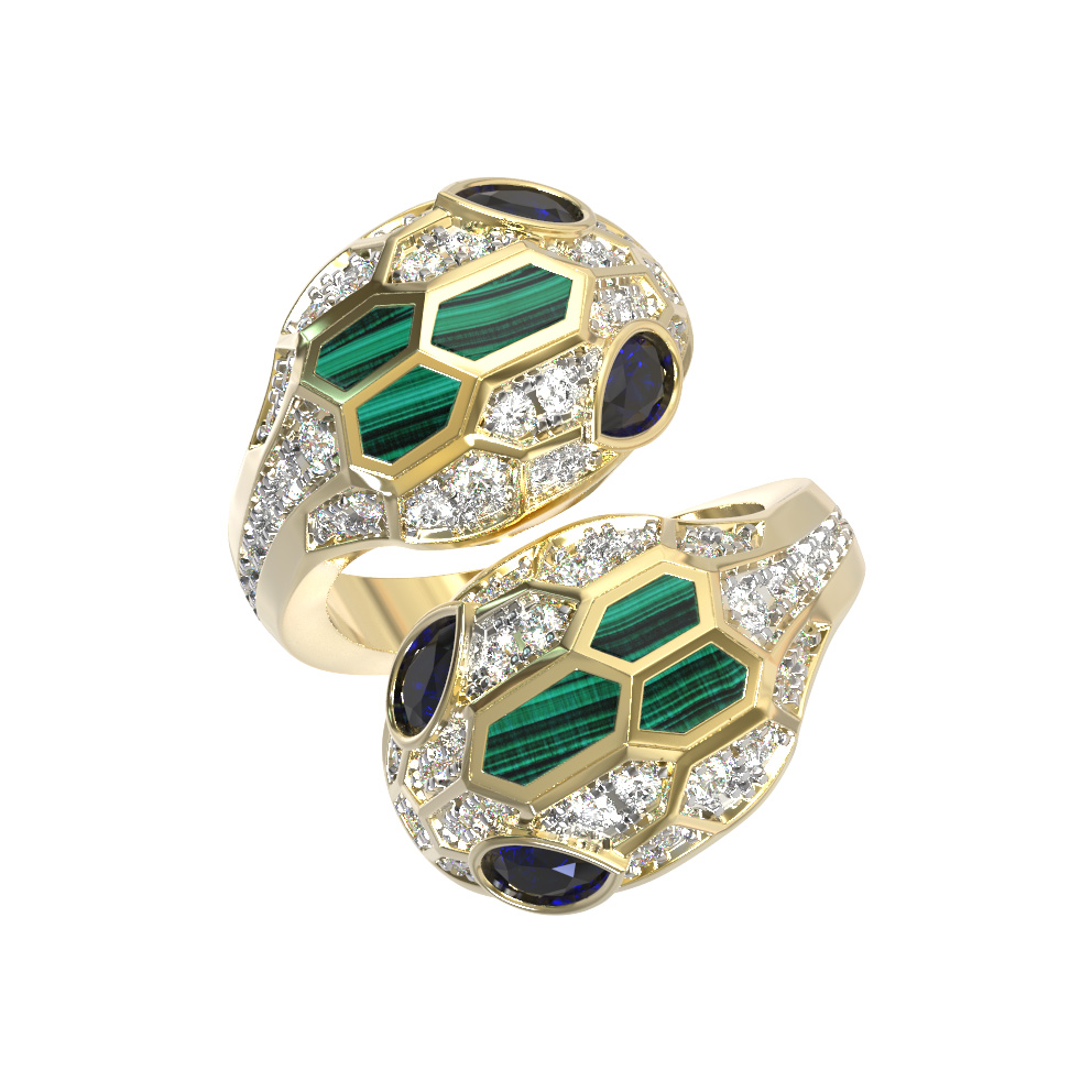 Кольцо из лимонного золота c бриллиантами, сапфиром и малахитом