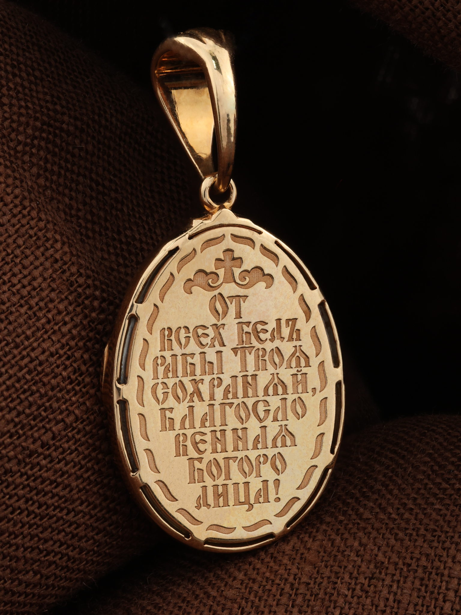 На оборотной стороне образка написана молитва: «От всех бед рабы Твоя сохраняй, Благословенная Богородица!»