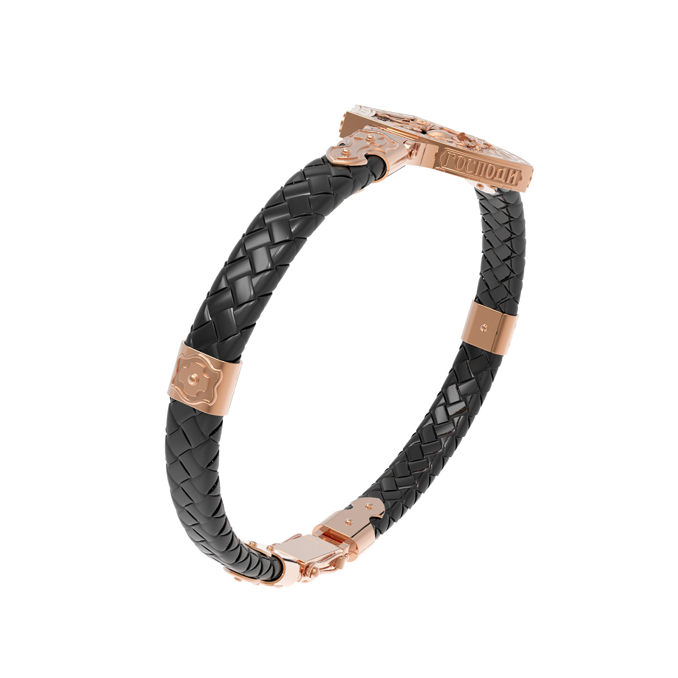 Основой композиции лицевой стороны браслета является изображение Святого Великомученика Георгия Победоносца — одного из самых почитаемых и удивительных святых. Георгий родился в Каппадокии (Малая Азия) в семье богатых и знатных горожан. Юношей поступил на службу к римскому императору Диоклетиану, за отличное знание военного дела и проявленную в боях и походах храбрость был приближен к императору и удостоен высокого воинского звания. Во время начавшихся гонений на христиан, перешел на сторону гонимых и, отвергнув человеческий страх, стал ярым проповедником учения Христа. Мучители подвергли опального воеводу жесточайшим восьмидневным пыткам и казнили его (обезглавили) в возрасте около тридцати лет в 303 году. На Руси он известен как Юрий или Егорий, заступник для верующих, чья жизнь имеет какое-либо отношение к военным делам, помощник в крестьянском труде. Браслет сделан в виде воинского щита. На нем Георгий изображен как воитель, сидящий на вздыбленном коне и поражающий копьем огнедышащего змея. Над образом изображена благословляющая Божия десница. Змей символизирует собою сатанинские силы. Молитвами вознесенными к Всевышнему и своей непреклонной верой он смог одолеть чудовище. Святой убил змея, спас царскую дочь, принесенную в жертву, и жителей города, их души от влияния дьявола, породив в них надежду и веру в Господа, призывая людей принять христианскую веру. На торце изделия помещена молитва: «Господи, помилуй мя грешного».