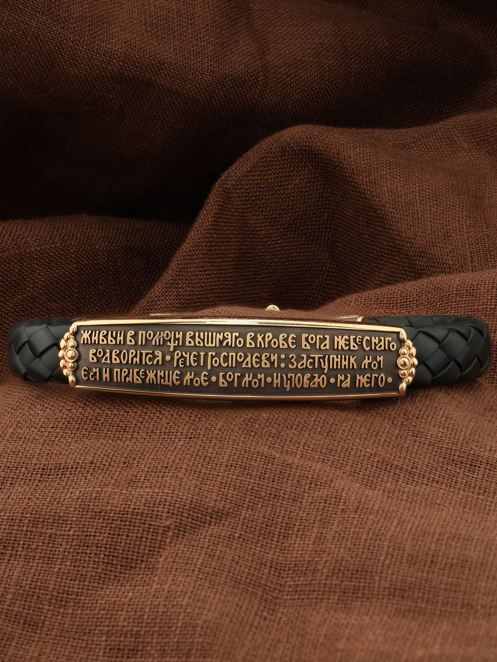 На основном звене браслета написана молитва: «Живый в помощи Вышняго, в крове Бога Небеснаго водворится. Речет Господеви: Заступник мой еси и Прибежище мое, Бог мой, и уповаю на Него.»
