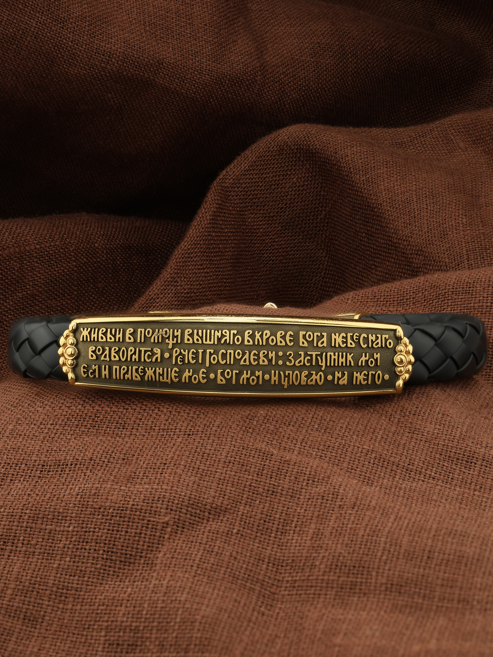 На основном звене браслета написана молитва: «Живый в помощи Вышняго, в крове Бога Небеснаго водворится. Речет Господеви: Заступник мой еси и Прибежище мое, Бог мой, и уповаю на Него.»