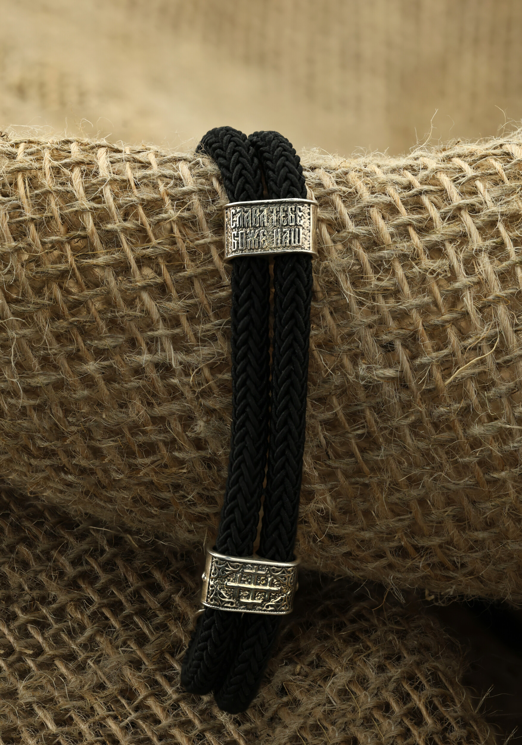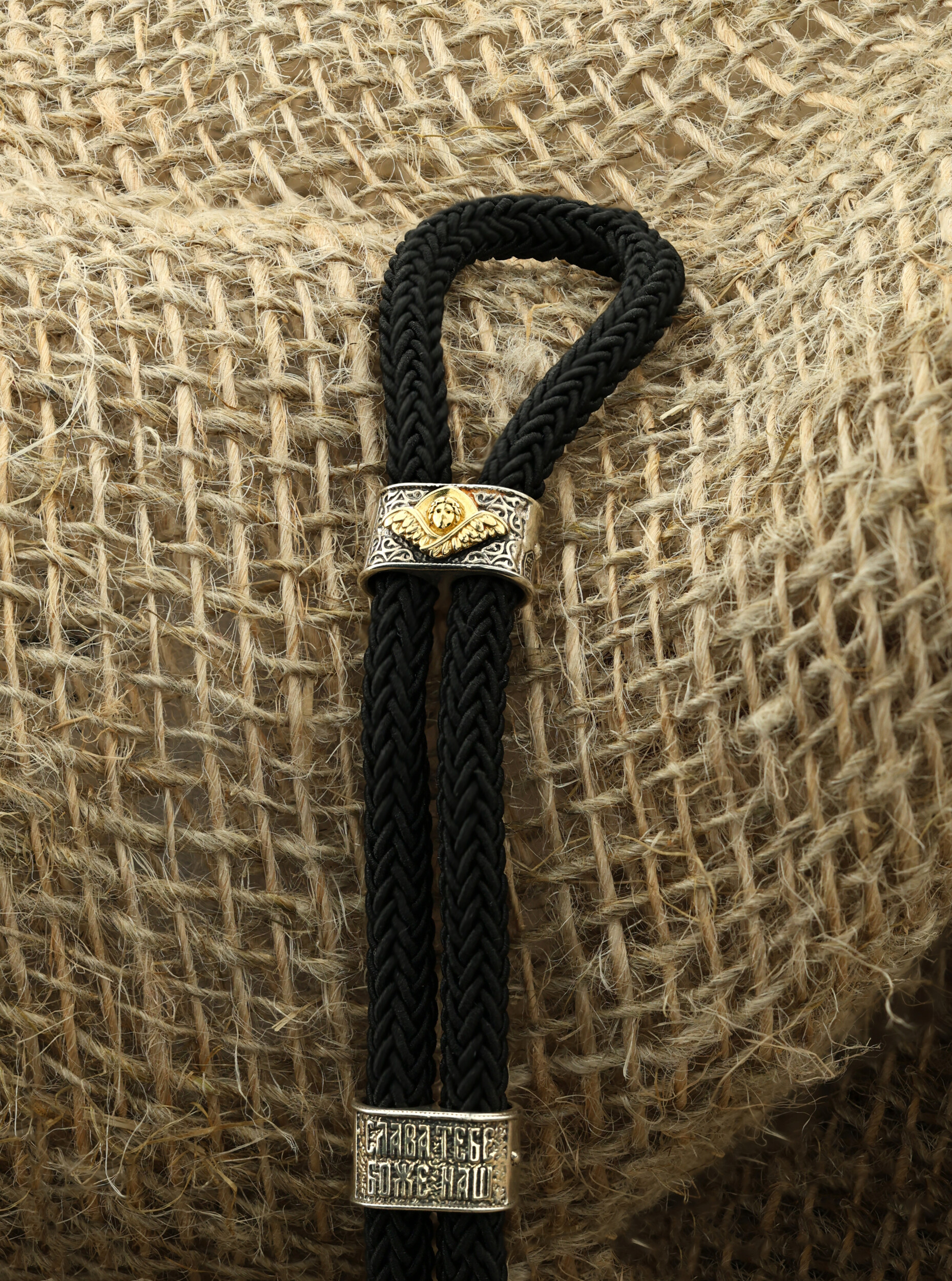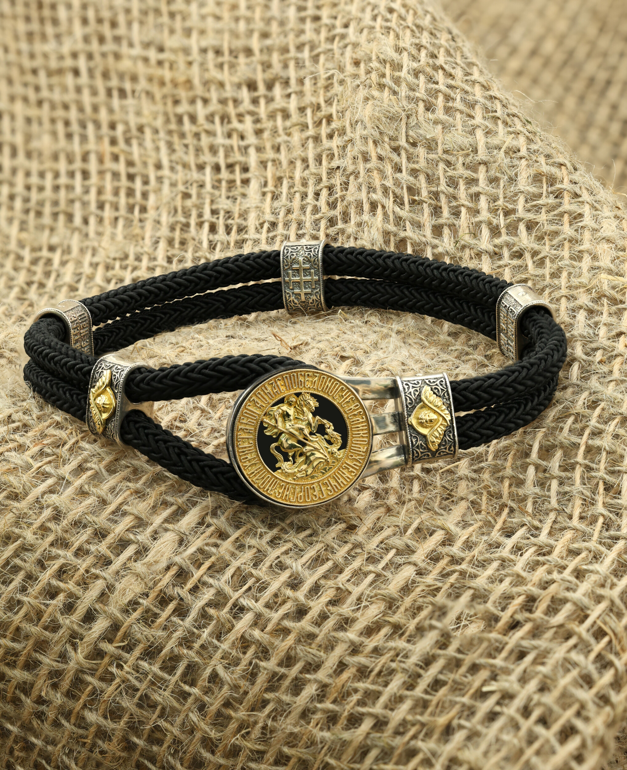 Браслет из серебра и золота c ониксом и шёлковым шнурком