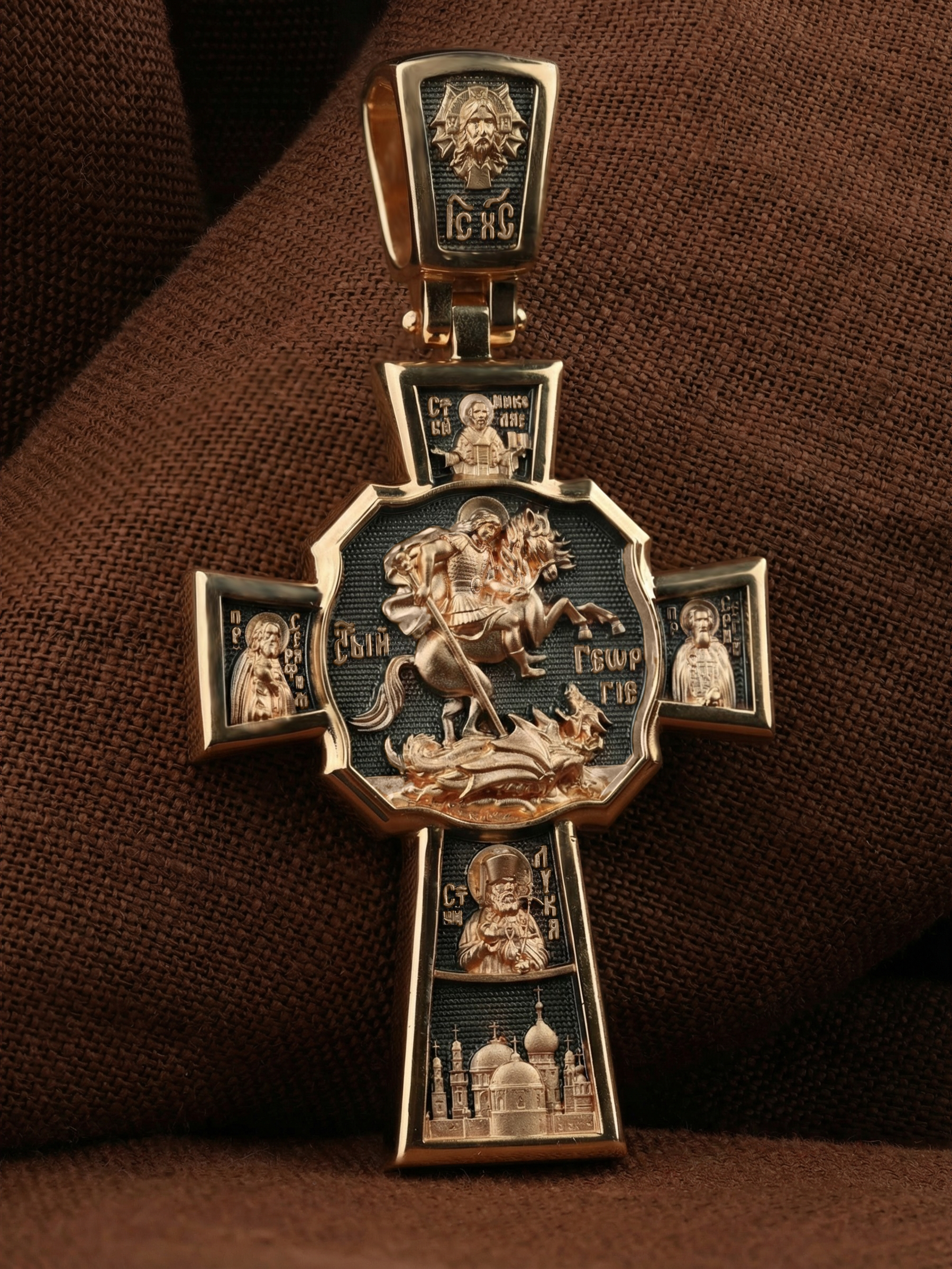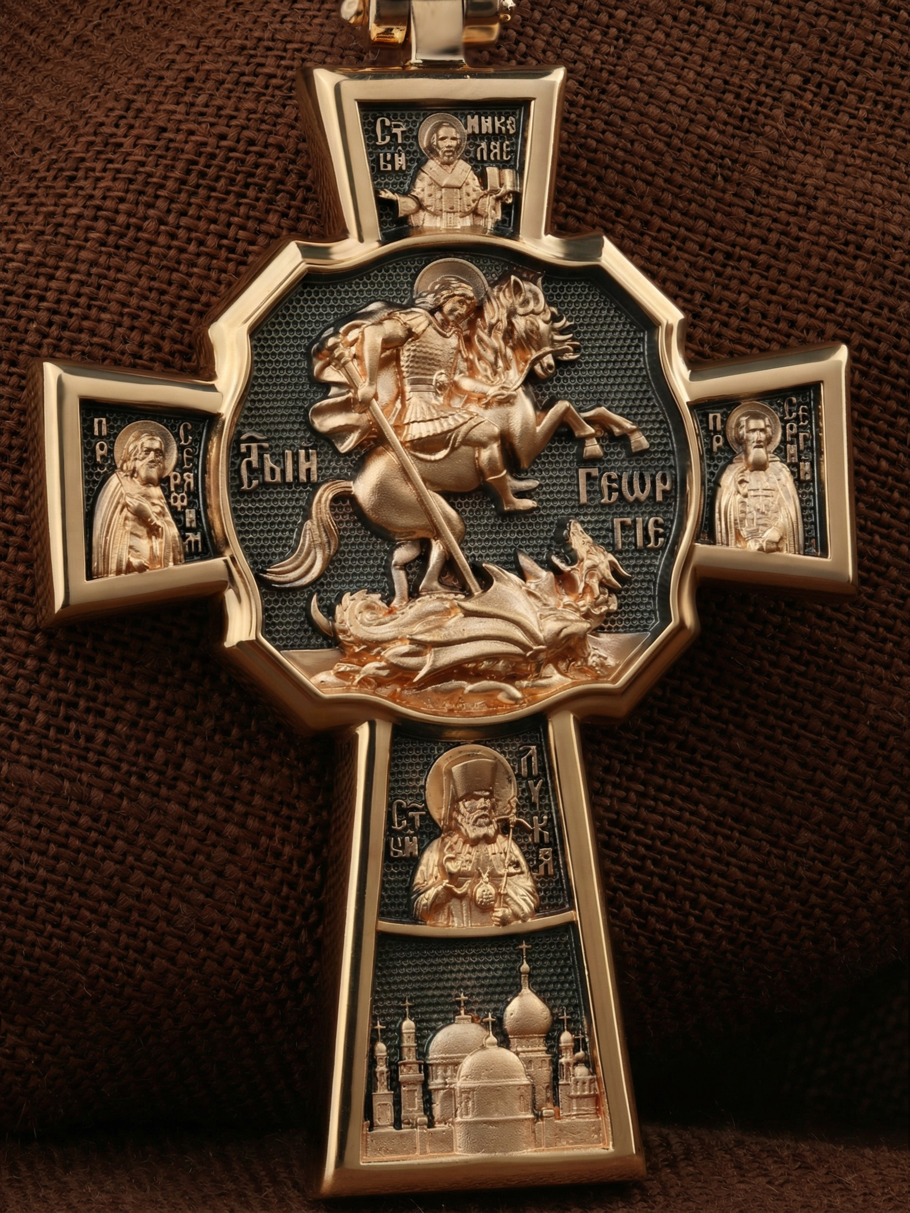 В центре оборотной стороне креста помещен образ Святого Великомученика Георгия Победоносца — одного из самых почитаемых и удивительных святых. На образке он изображен как воитель поражающий копьем огнедышащего змея. Змей символизирует собою сатанинские силы. Справа помещен образ Святого Преподобного Сергия, игумена Радонежского, чудотворца, слева — Преподобного Серафима Саровского, чудотвореца. Выше помещен образ Святителя Николая архиепископа Мир Ликийских, чудотвореца, ниже — образ святителя Луки (Войно-Ясенецкого), архиепископа Симферопольского и Крымского, исповедника и изображение Храма. На кулонном кольце изображен Спас Нерукотворный — образ Господа и Спасителя нашего Иисуса Христа, чудесно отпечатавшийся на плате, котором Христос вытер свой лик.
