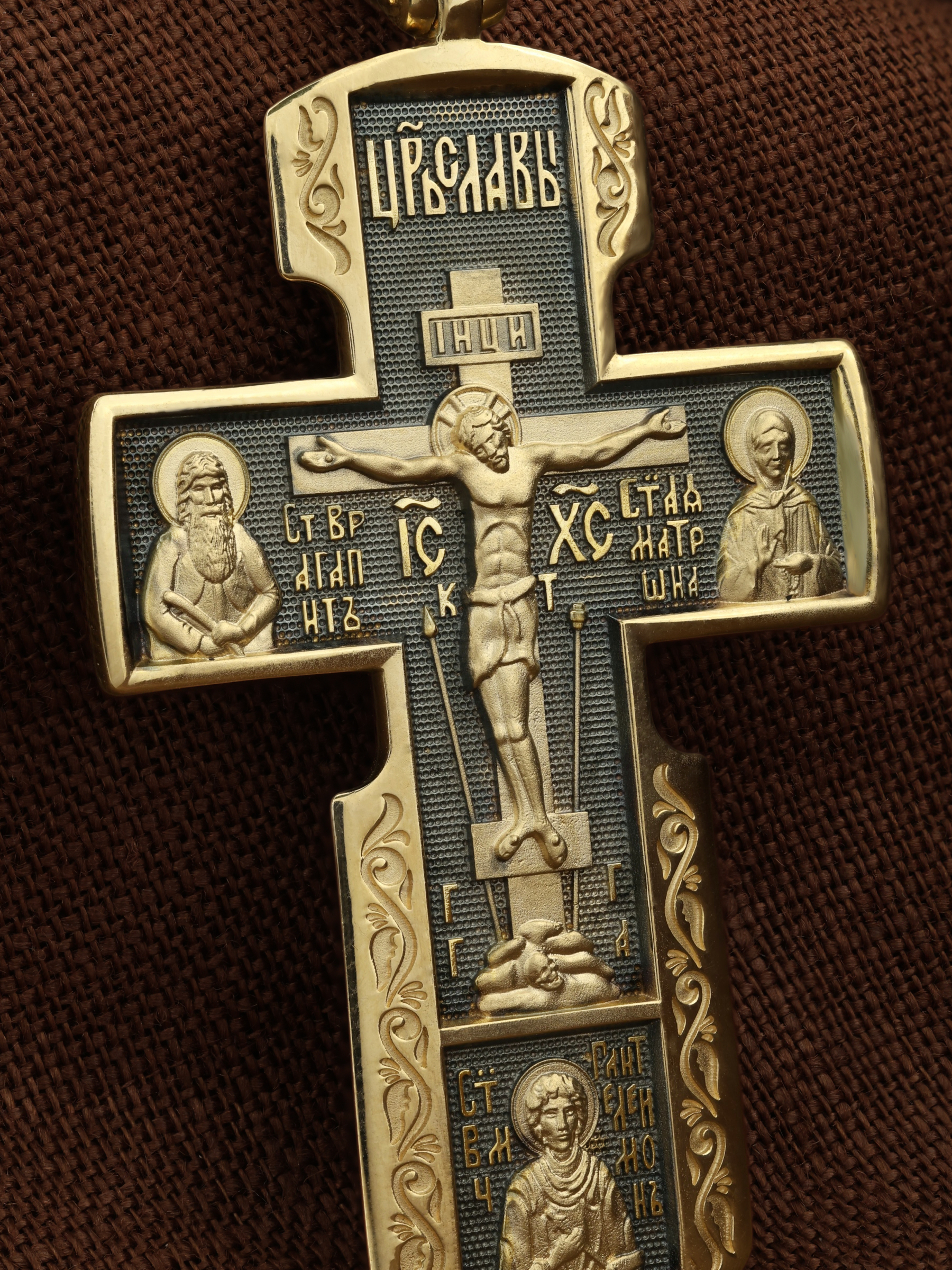На лицевой стороне креста изображено Распятие Иисуса Христа на Голгофском Кресте. Над титлом видим слова «ЦРЬ СЛВЫ» — Царь Славы. Верхняя перекладина символизирует собой табличку с надписью «IHЦI» — Иисус Назарянин Царь Иудейский. Над перекладиной пишется сокращенно имя Спасителя «IC XC» — Иисус Христос, ниже перекладины добавляется: «НИКА» (греч. — Победитель). Возвышение, на котором стоит Крест, символизирует гору Голгофу, на которой произошло Распятие. У подножия Креста изображают прах Адама, обозначенный черепом.. Справа от Распятия помещен образ прославленной святой блаженной Матроны. «Матронушка», — ласково называют эту святую православные за удивительную любовь и помощь, которую она подает всем нуждающимся в ее поддержке. Слева — икона прп. Агапита. Этот святой жил в пещерах Киево-Печерского монастыря в XI веке и бескорыстно врачевал мирян и монахов.