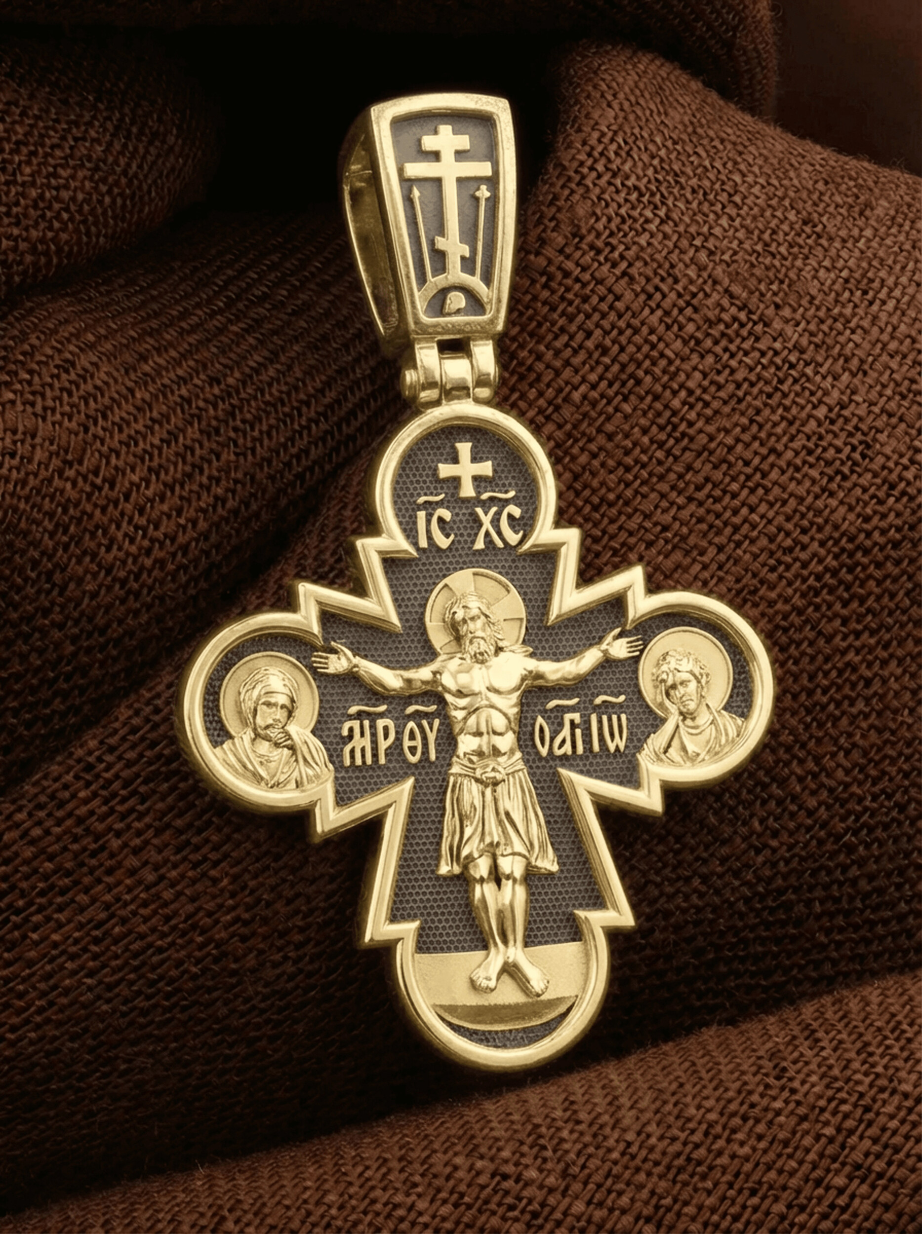На лицевой стороне этого креста Иисус Христос является как Господь, Творец мира и его Грозный Судия, царящий на Небесах. Православная иконография показывает нам распятого Господа не в виде мучительно умирающего человека, а как величественного и всесильного Бога, который простирает руки, словно обнимает весь мир. Человеческие страдания Господа обычно только обозначаются наклоном Его головы и полузакрытыми глазами. С двух сторон Христу предстоят Пресвятая Богородица и Святой апостол и Евангелист Иоанн Богослов.