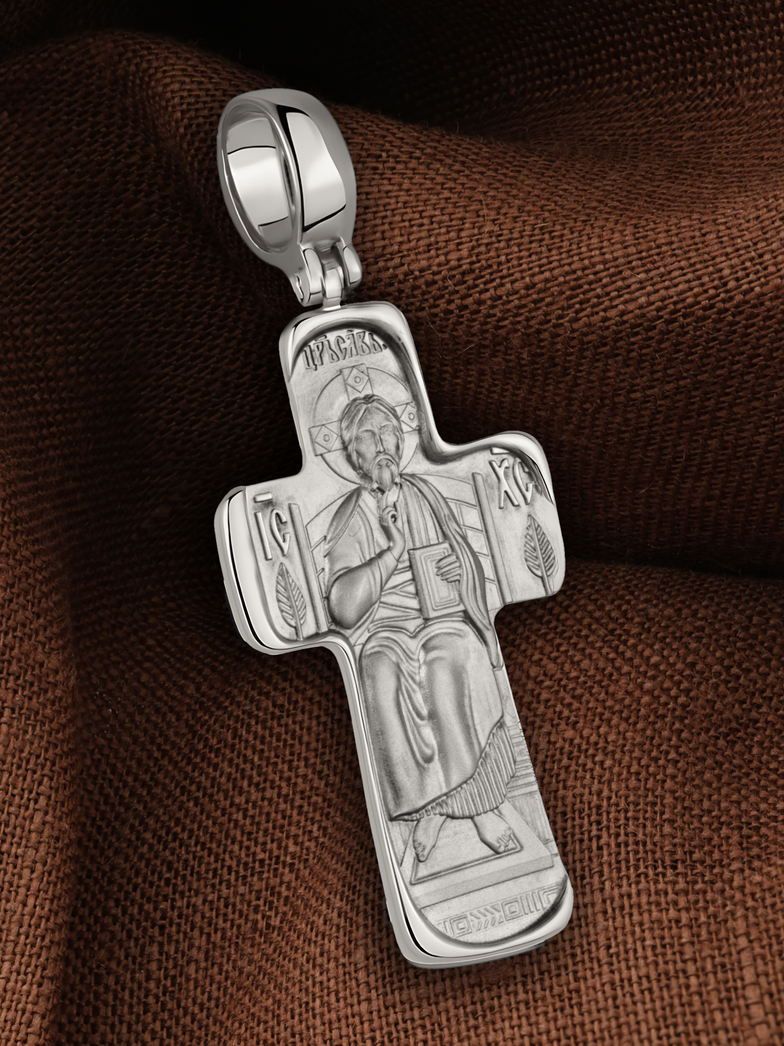 На лицевой стороне креста помещен образ Господа Иисуса Христа «Спас Вседержитель». Он изображен восседающим на престоле. Господь представлен как Царь Небесный и будущий Судия мира. Именование Иисуса «Вседержителем» указывает, с одной стороны, на Его Божественную природу: «Аз есмь Альфа и Омега, начало и конец, говорит Господь, Который есть и был и грядет, Вседержитель» (Откр. 1: 8). С другой стороны, такое именование связано и с человеческой природой Христа, искупившего крестной жертвой людские грехи и обновившего тем самым человеческую природу. В левой руке Он держит открытую Книгу, а правой рукой благословляет. Книга символизирует Евангелие — благую весть, принесенную Христом всему миру. Символизирует и Книгу Жизни, где записаны имена всех, возлюбивших Бога. Образ сопровождается каноническими надписями: «Царь Славы» и «IС ХС», что означает Иисус Христос.