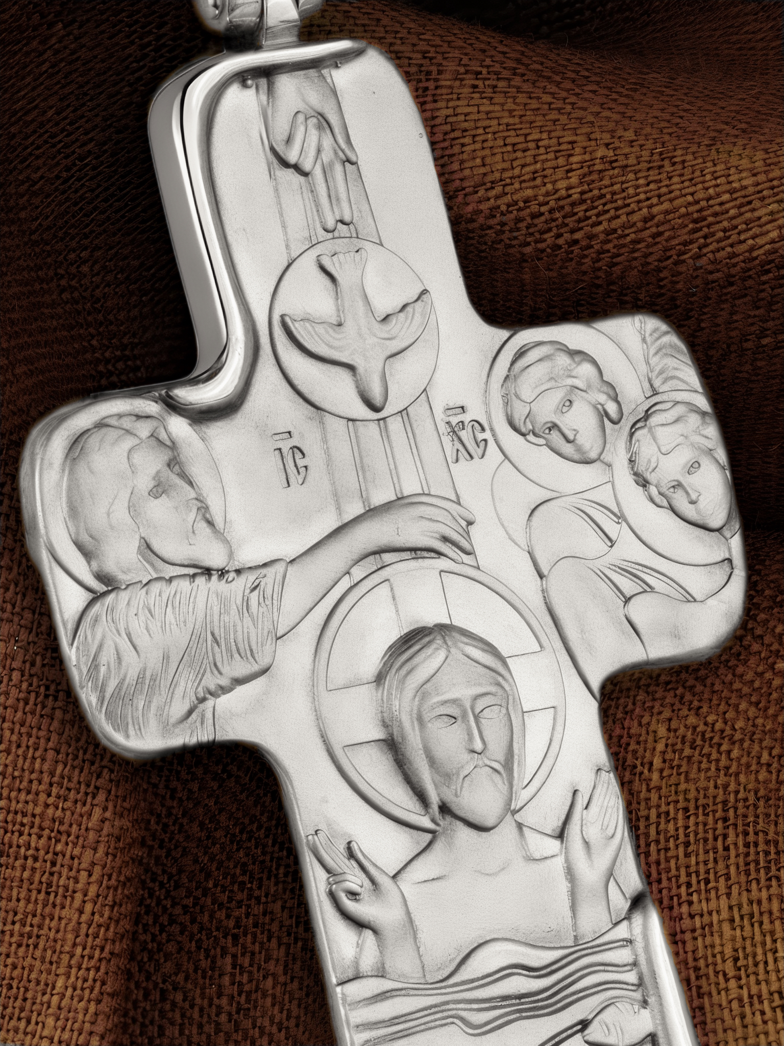 На оборотной стороне креста изображено «Крещение Господне». В образе запечатлено не только Крещение Спасителя во Иордане от Иоанна Предтечи, но, прежде всего, явление миру воплотившегося Сына Божия как Одного из Лиц Святой Троицы, о Котором свидетельствуют благословляющий десницей Отец и Святой Дух, сошедший на Христа в виде голубя. Справа изображены ангелы, склонившиеся ко Христу и, подобно восприемникам от купели, держащие покровы на руках.