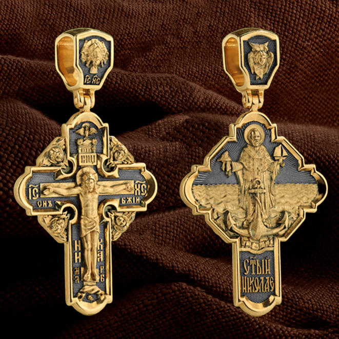 На лицевой стороне креста изображено Распятие Господа и Спасителя нашего Иисуса Христа, отдавшего Себя на смерть, чтобы другие могли жить — жить вечной жизнью, жить с Богом. Своею кровью Господь освятил крест и сделал его проводником Своей благодати, источником освящения верующих. На верхней табличке, выше головы Иисуса, расположена надпись, составленная Понтием Пилатом — «ИНЦИ». Она означает «Иисус Назорей, Царь Иудейский». Надпись «IС ХС» означает Иисус Христос помещается на разных сторонах поперечной (большой) перекладины креста. На кулонном кольце помещено изображение Духа Святого в виде голубя, сходящего с Небес