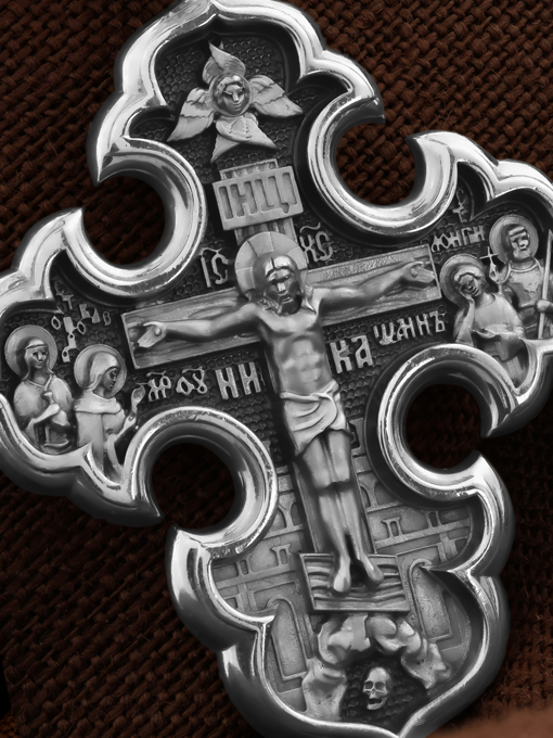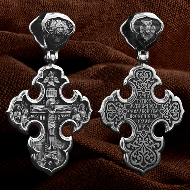 На лицевой стороне креста изображено Распятие Господа и Спасителя нашего Иисуса Христа. Своими крестными страданиями Господь смыл наши грехи, покрыл наш долг перед Богом или, на языке Писания, нас «искупил». В Голгофе сокрыта непостижимая тайна бесконечной правды и любви Бога. Крест стал символом победы добра над злом, жизни над смертью, напоминанием бесконечной Божьей любви, предметом радости. Воплотившийся Сын Божий Своею кровью освятил крест и сделал его проводником Своей благодати, источником освящения верующих. На верхней табличке, выше головы Иисуса, расположена надпись, составленная Понтием Пилатом — «IНЦI». Она означает «Иисус Назорей, Царь Иудейский». Ниже перекладины написано сокращенно имя Спасителя «IC» «XC» — Иисус Христос. Крест стоит на горе камней, символизирующих Голгофу. Под подножием Креста изображена покоящаяся голова (череп) Адама. Слева от Распятия стоят оплакивающие Господа Пресвятая Богородица и святая мироносица Мария Клеопова. Справа — апостол и евангелист Иоанн Богослов, один из ближайших учеников Иисуса Христа и сотник Лонгин с крестом в правой руке и копьем — в левой. По преданию, увидя, что они горько плачут, Иисус сказал Матери Своей: «Жено! Се сын Твой!» Потом сказал ученику Иоанну: «Се мати твоя». С этого времени Иоанн взял Матерь Божию к себе, и Она жила в его доме до самой смерти. На кулонном кольце изображен Спас Нерукотворный — образ Господа и Спасителя нашего Иисуса Христа, чудесно отпечатавшийся на плате, которым Христос вытер свой лик.