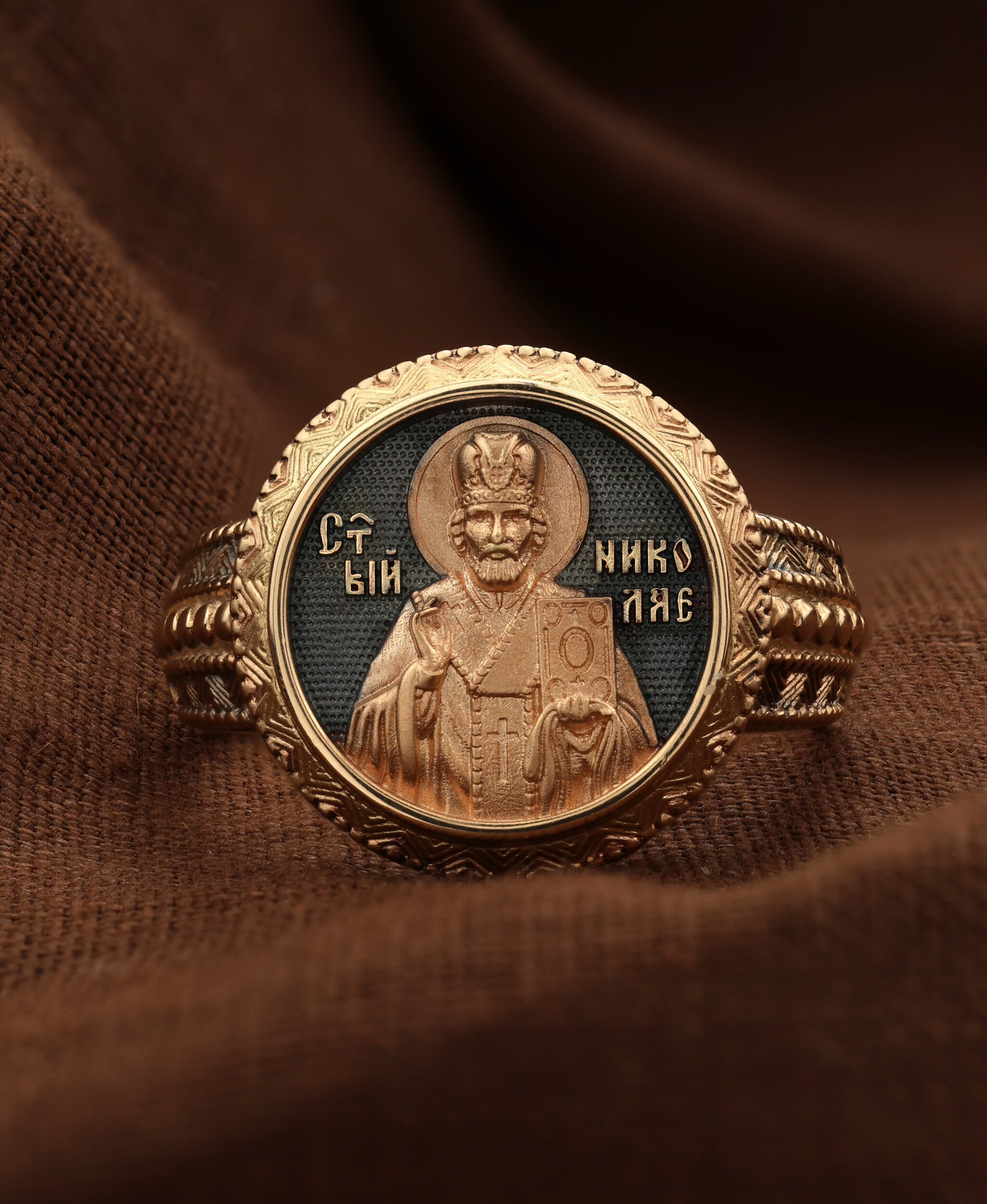 С внутренней стороны кольца выгравирована молитва: «Отче Николае, моли Христа Бога спастися душам нашим».