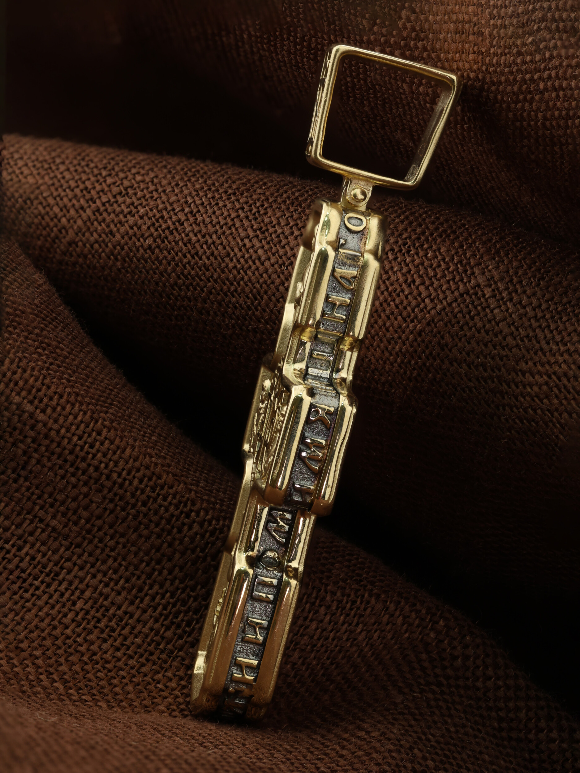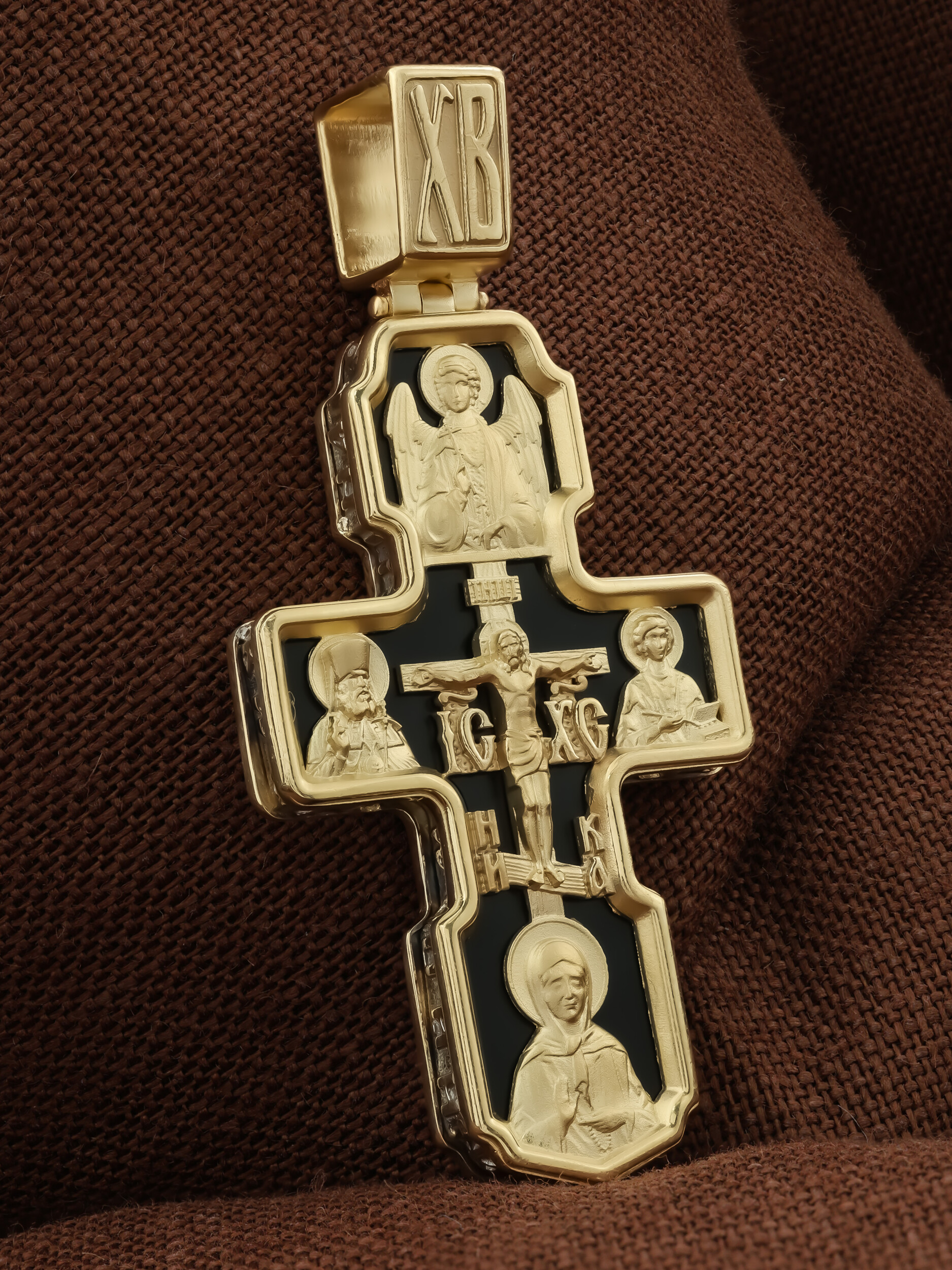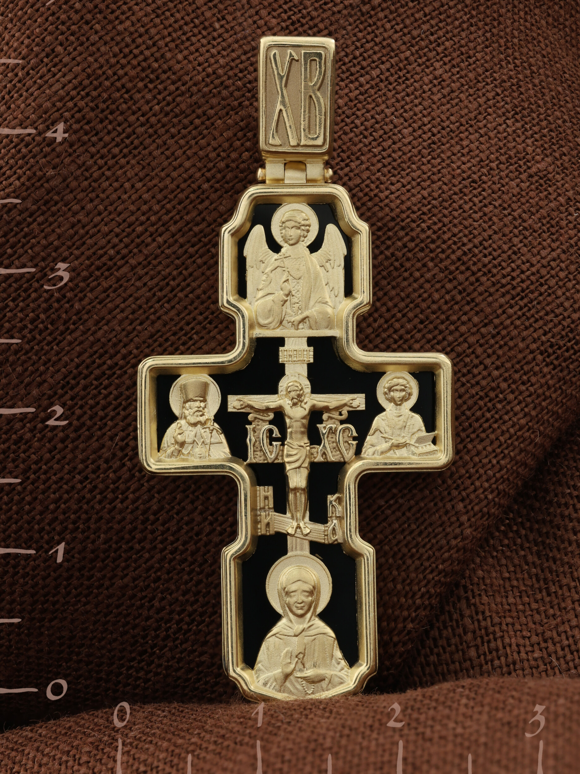 На лицевой стороне креста изображено Распятие Господа и Спасителя нашего Иисуса Христа. Христос, подвергнутый на кресте мучительной казни, своими страданиями искупил нас от древнего греха и даровал нам жизнь вечную. Без Распятия не было бы Воскресения Христова, и поэтому Крест из орудия казни обратился в святыню, в которой действует Благодать Божия. На верхней табличке, выше головы Иисуса, расположена надпись, составленная Понтием Пилатом на трех языках — «IНЦI». Она означает «Иисус Назорей, Царь Иудейский». Надпись «IС ХС» означает Иисус Христос и помещается на разных сторонах поперечной (большой) перекладины креста. На нижней перекладине находится надпись –«НИКА», что означает победитель. Над Распятием изображен Святой Ангел-Хранитель держащий крест в правой руке. Ниже Распятия — образ Святой блаженной старицы Матроны Московской. Справа — образ Свя¬того ве¬ли¬ко-му¬че¬ника и це¬ли¬теля Пан¬те¬ле¬и¬мона, а слева — образ Святителя Луки (Войно-Ясенецкого). На кулонном кольце находится надпись «ХВ», что означает Христос Воскрес. На торцевой стороне креста размещены слова Иисусовой молитвы: «Господи Иисусе Христе, Сыне Божий, помилуй мя, грешного».