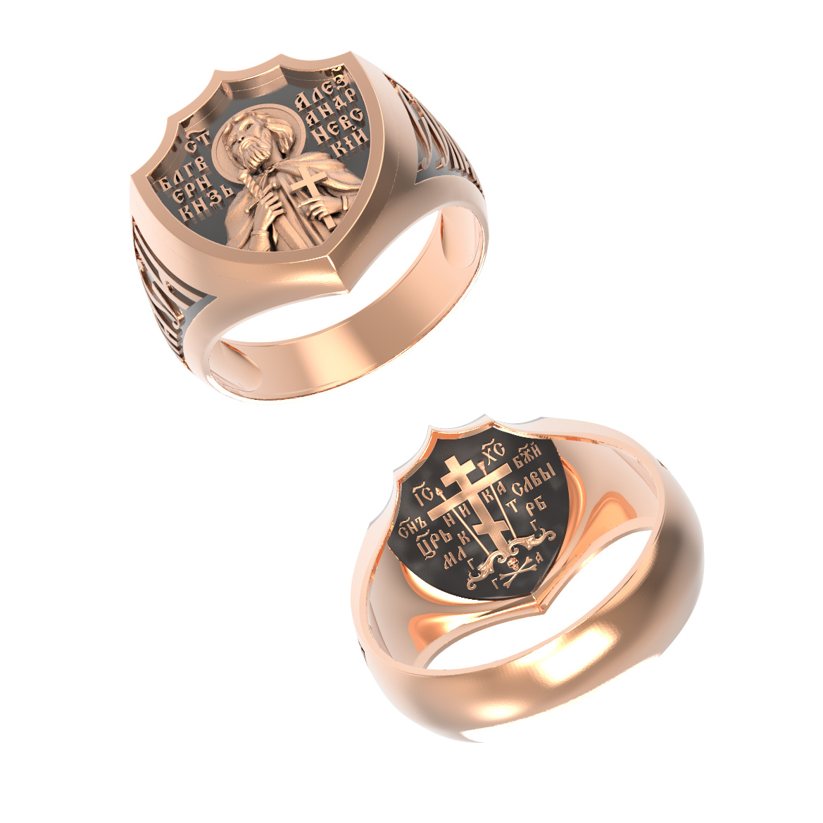 С внутренней стороны кольца изображен «Голгофский крест». Центральным и главным элементом композиции лицевой стороны является восьмиконечный крест — образ Честного и Животворящего Креста Господня, установленного на горе Голгофе. В основании креста изображена гора Голгофа, на которой был распят Спаситель и череп Адама, чьи кости по приданию омыла кровь Иисуса Христа. Перед головой располагаются лежащие кости рук, изображаются правая на левой, как при погребении или причащении. В XVI веке на Руси около изображения Голгофы появились обозначения «М.Л.Р.Б.» — Место Лобное Рай Бысть (Голгофа в переводе с еврейского — Лобное место). Чуть ниже справа и слева буквы «Г.Г.» — гора Голгофа.