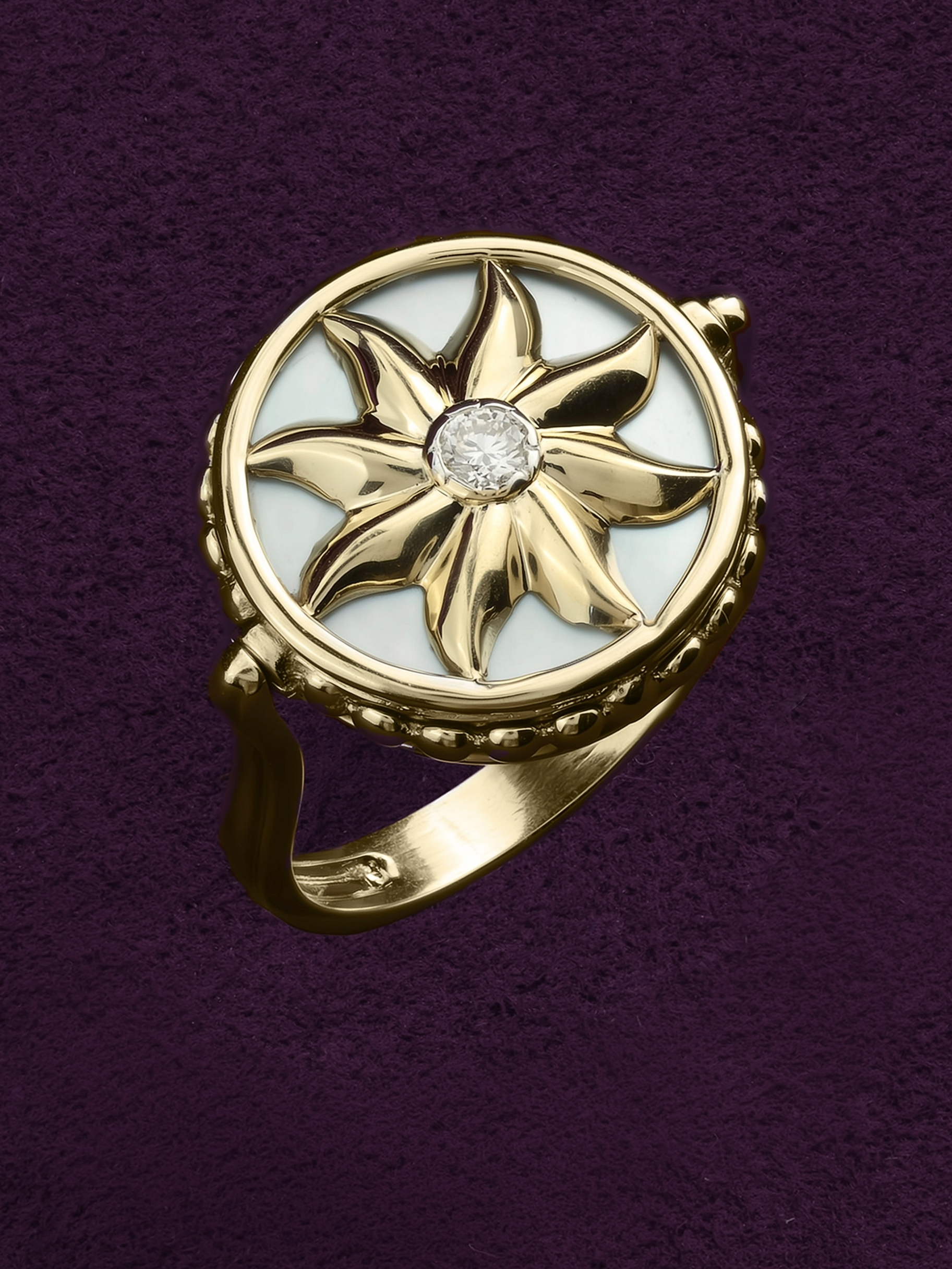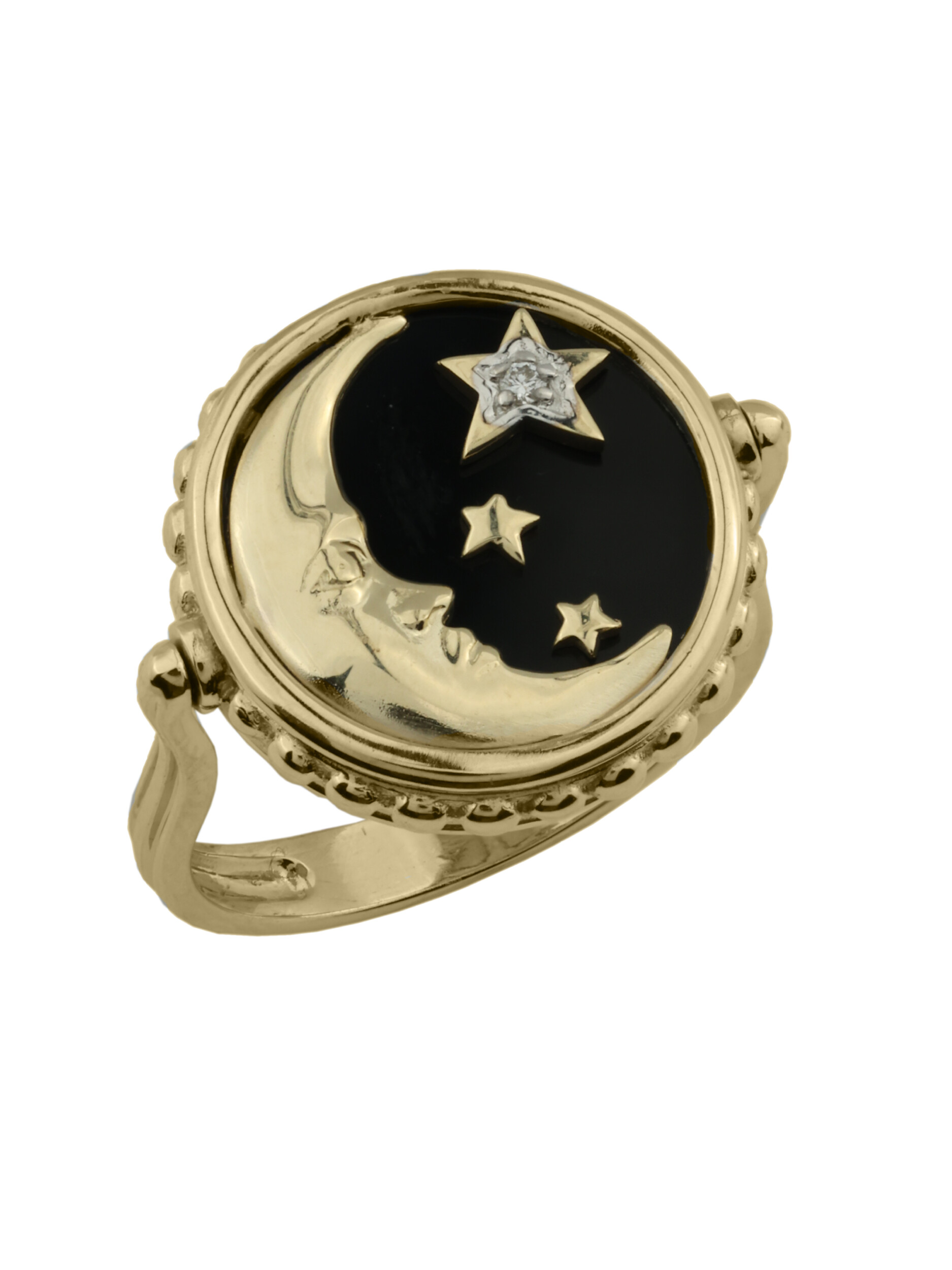 Кольцо из лимонного золота c бриллиантами, ониксом и перламутром