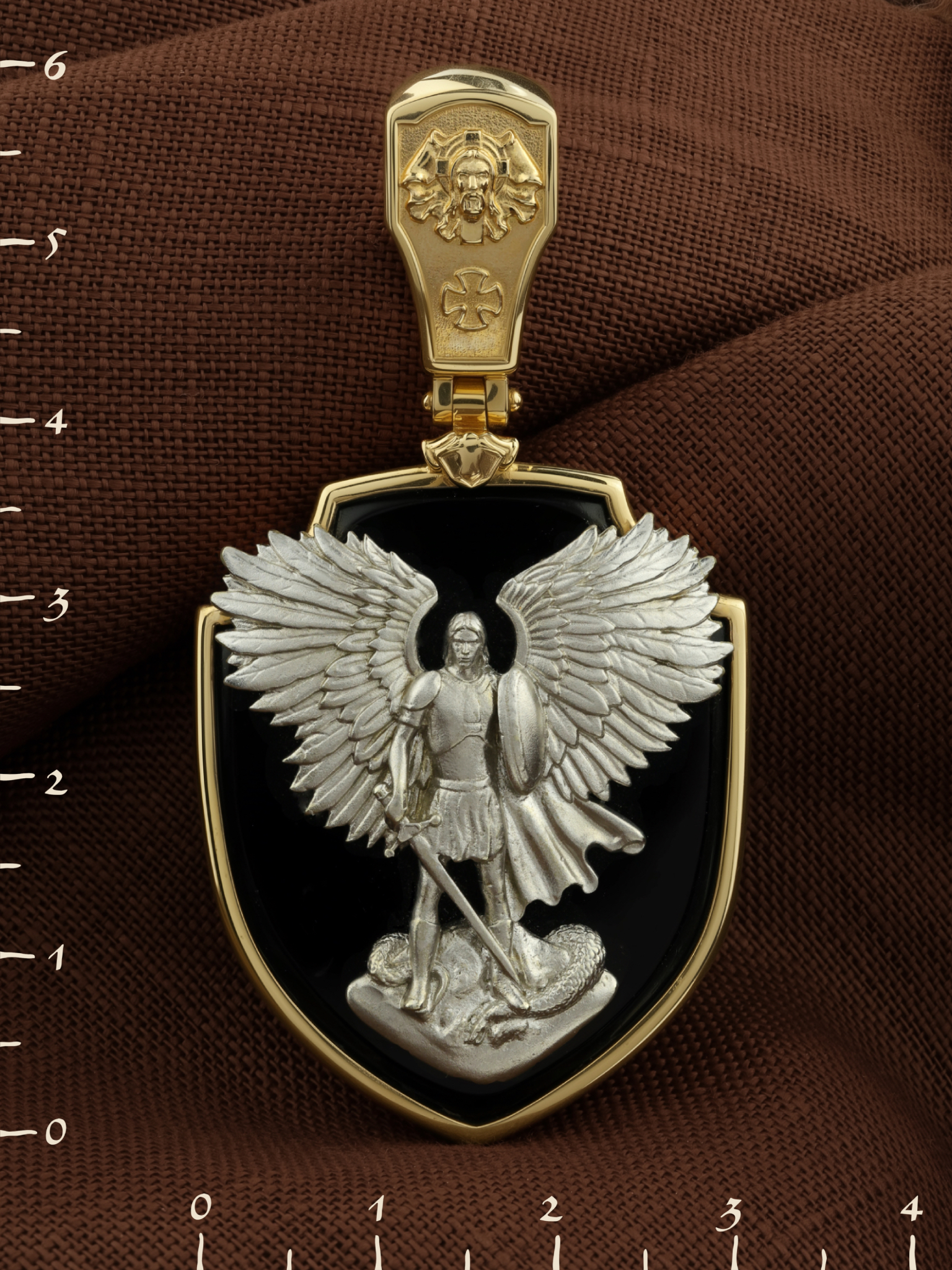 На лицевой стороне образка размещено изображение Архангела Михаила — верного служителя Божия, который низринул с Неба возгордившегося денницу с другими павшими духами. В Православии его называют Архистратигом, что означает глава святого воинства Ангелов и Архангелов. Образок сделан в виде воинского щита. Архангел Михаил изображен в воинственном виде с огненным мечом в правой руке и щитом в левой поражающим змея. Змей символизирует собою сатанинские силы. Архангел почитается, как покровитель воинов и всех верных Богу и ведущих борьбу против сил зла, борец против ересей, а также защитник душ умерших, страж райских врат. С древних времен прославлен своими чудесами Архангел Михаил на Руси. Примеров явления и помощи Архистратига Михаила в русской истории бессчетно. Архангел Михаил не перестает ратоборствовать за славу Творца и Господа всяческих, за дело спасения рода человеческого, за церковь и чад ее. И, согласно, Откровению Иоанна Богослова во время последней битвы небесных и дьявольских сил Михаил и его ангелы опять низвергнут люцифера вместе с его войском: «Михаил и Ангелы его воевали против дракона, и дракон и ангелы его воевали [против них], но не устояли, и не нашлось уже для них места на небе. И низвержен был великий дракон, древний змий, называемый диаволом и сатаною, обольщающий всю вселенную, низвержен на землю, и ангелы его низвержены с ним» (Откр.12:7−9). На кулонном кольце изображен Нерукотворный образ Господа и Спасителя нашего Иисуса Христа, чудесно отпечатавшийся на плате, которым Христос вытер свой лик.