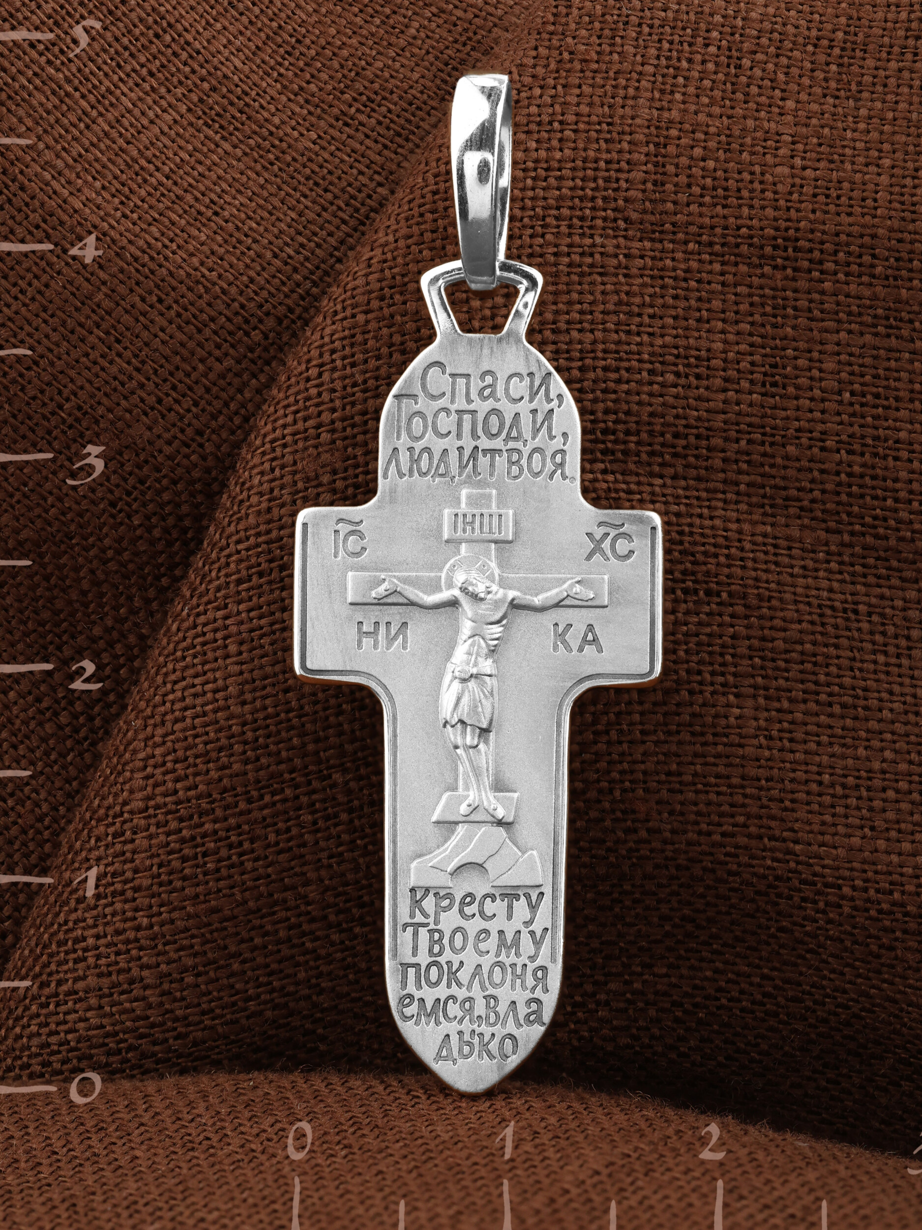 На лицевой стороне креста изображено Распятие Господа и Спасителя нашего Иисуса Христа. Крест- символ спасения и искупления рода человеческого, знамение победы над смертью и адом. Иисус Христос, как искупительная жертва освобождения человечества от власти греха, умер крестной смертью и в третий день воскрес. На верхней табличке, выше головы Иисуса, расположена надпись, составленная Понтием Пилатом — «IНЦI». Она означает «Иисус Назорей, Царь Иудейский». Надпись «IC» «ХC», означает Иисус Христос, помещается на разных сторонах поперечной перекладины креста. Под ней помещено слово «НIКА», что означает Победитель. Крест стоит на горе камней, символизирующих Голгофу.