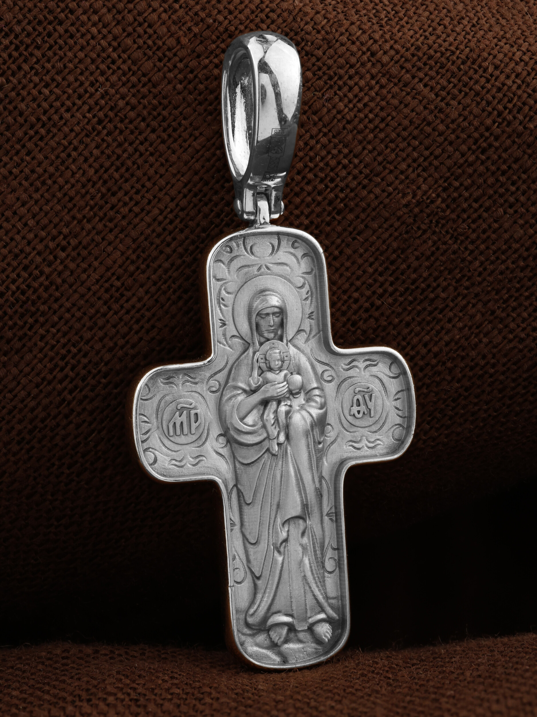 На лицевой стороне креста изображено Распятие Господа и Спасителя нашего Иисуса Христа. Крест- символ спасения и искупления рода человеческого, знамение победы над смертью и адом. Иисус Христос, как искупительная жертва освобождения человечества от власти греха, умер крестной смертью и в третий день воскрес. Над вершиной Распятия помещена надпись «Царь Славы». Надпись «IС» « ХС» означает Иисус Христос и помещается на разных сторонах поперечной перекладины креста. Рядом расположена надпись «Сын Божий». Слева от Распятия изображена Пресвятая Богородица, справа — апостол и евангелист Иоанн Богослов, один из ближайших учеников Иисуса Христа. Крест стоит на горе камней, символизирующих Голгофу. В ее основании различается череп — это голова Адама. Вдоль креста изображены копие сотника Лонгина и трость с губкой. На православном кресте Христос не умирает, а свободно простирает руки, ладони Иисуса открыты, будто он хочет обнять все человечество, даря им свою любовь и открывая путь к вечной жизни.