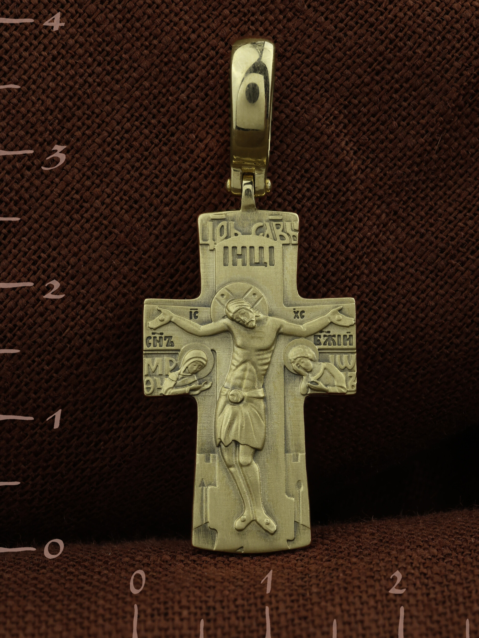 На лицевой стороне креста изображено Распятие Господа и Спасителя нашего Иисуса Христа, отдавшего Себя на смерть, для искупления грехов мира. Крест является символом жертвенной любви Всеблагого Бога к падшим людям, всепобеждающим духовным оружием христиан, основанием и средоточием церковной жизни. Над вершиной Распятия помещена надпись «Царь Славы». На верхней табличке, выше головы Иисуса, расположена надпись, составленная Понтием Пилатом — «IНЦI». Она означает «Иисус Назорей, Царь Иудейский». Распятие сопровождается каноническими надписями. Надпись «IC» «ХC», означает Иисус Христос и словосочетание «СЫН БОЖИЙ», что означает божественную природу Иисуса Христа, помещаются на разных сторонах поперечной перекладины креста. Слева от Распятия изображена Пресвятая Богородица, справа — апостол и евангелист Иоанн Богослов, один из ближайших учеников Иисуса Христа. Вдоль креста изображены копие сотника Лонгина и трость с губкой. За Распятием высится Иерусалимская стена, в знак того, что Господь был распят вне стен города.