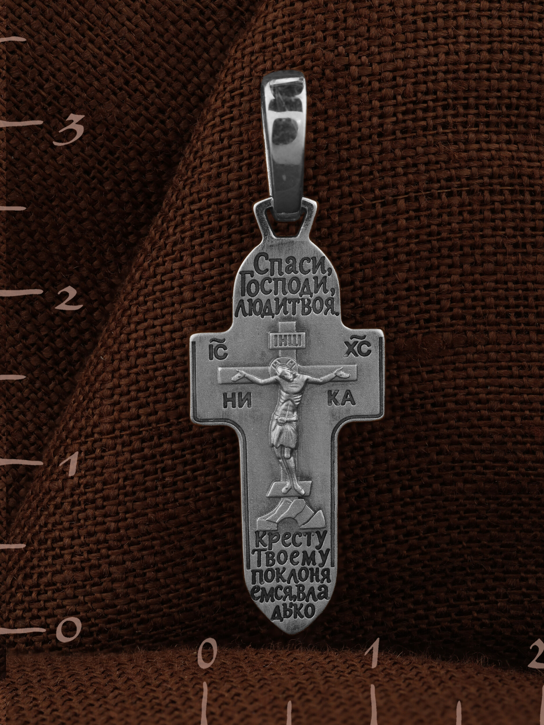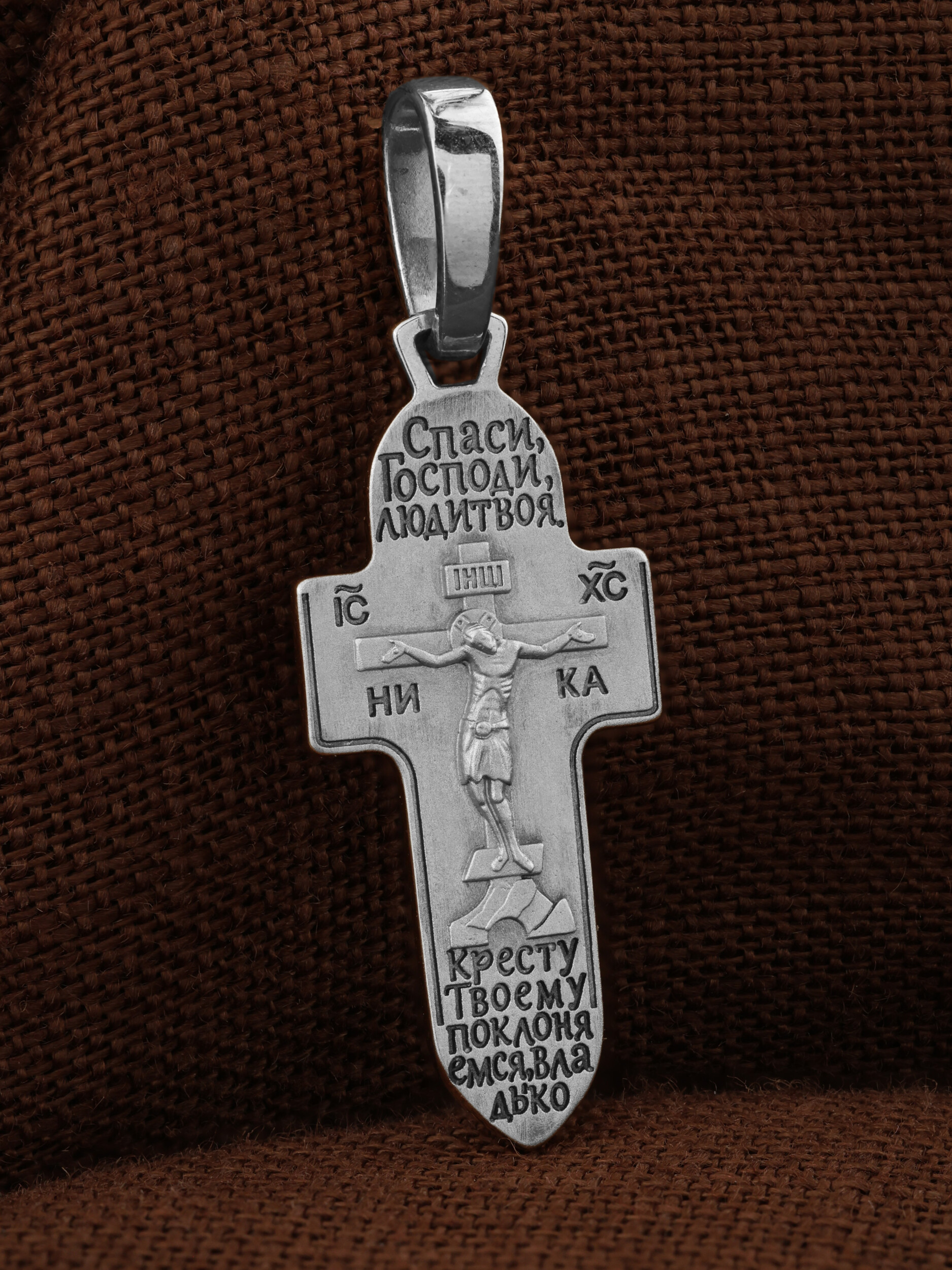 На лицевой стороне креста изображено Распятие Господа и Спасителя нашего Иисуса Христа. Крест- символ спасения и искупления рода человеческого, знамение победы над смертью и адом. Иисус Христос, как искупительная жертва освобождения человечества от власти греха, умер крестной смертью и в третий день воскрес. На верхней табличке, выше головы Иисуса, расположена надпись, составленная Понтием Пилатом — «IНЦI». Она означает «Иисус Назорей, Царь Иудейский». Надпись «IC» «ХC», означает Иисус Христос, помещается на разных сторонах поперечной перекладины креста. Под ней помещено слово «НIКА», что означает Победитель. Крест стоит на горе камней, символизирующих Голгофу.