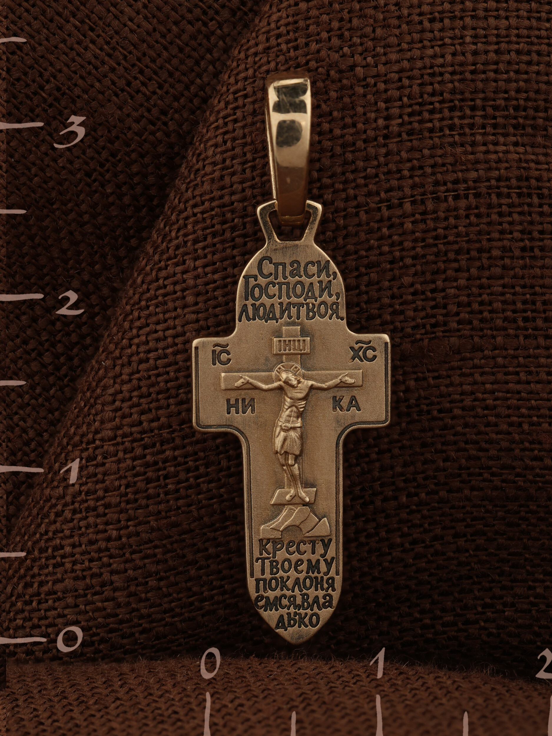 На лицевой стороне креста изображено Распятие Господа и Спасителя нашего Иисуса Христа. Крест- символ спасения и искупления рода человеческого, знамение победы над смертью и адом. Иисус Христос, как искупительная жертва освобождения человечества от власти греха, умер крестной смертью и в третий день воскрес. На верхней табличке, выше головы Иисуса, расположена надпись, составленная Понтием Пилатом — «IНЦI». Она означает «Иисус Назорей, Царь Иудейский». Надпись «IC» «ХC», означает Иисус Христос, помещается на разных сторонах поперечной перекладины креста. Под ней помещено слово «НIКА», что означает Победитель. Крест стоит на горе камней, символизирующих Голгофу.