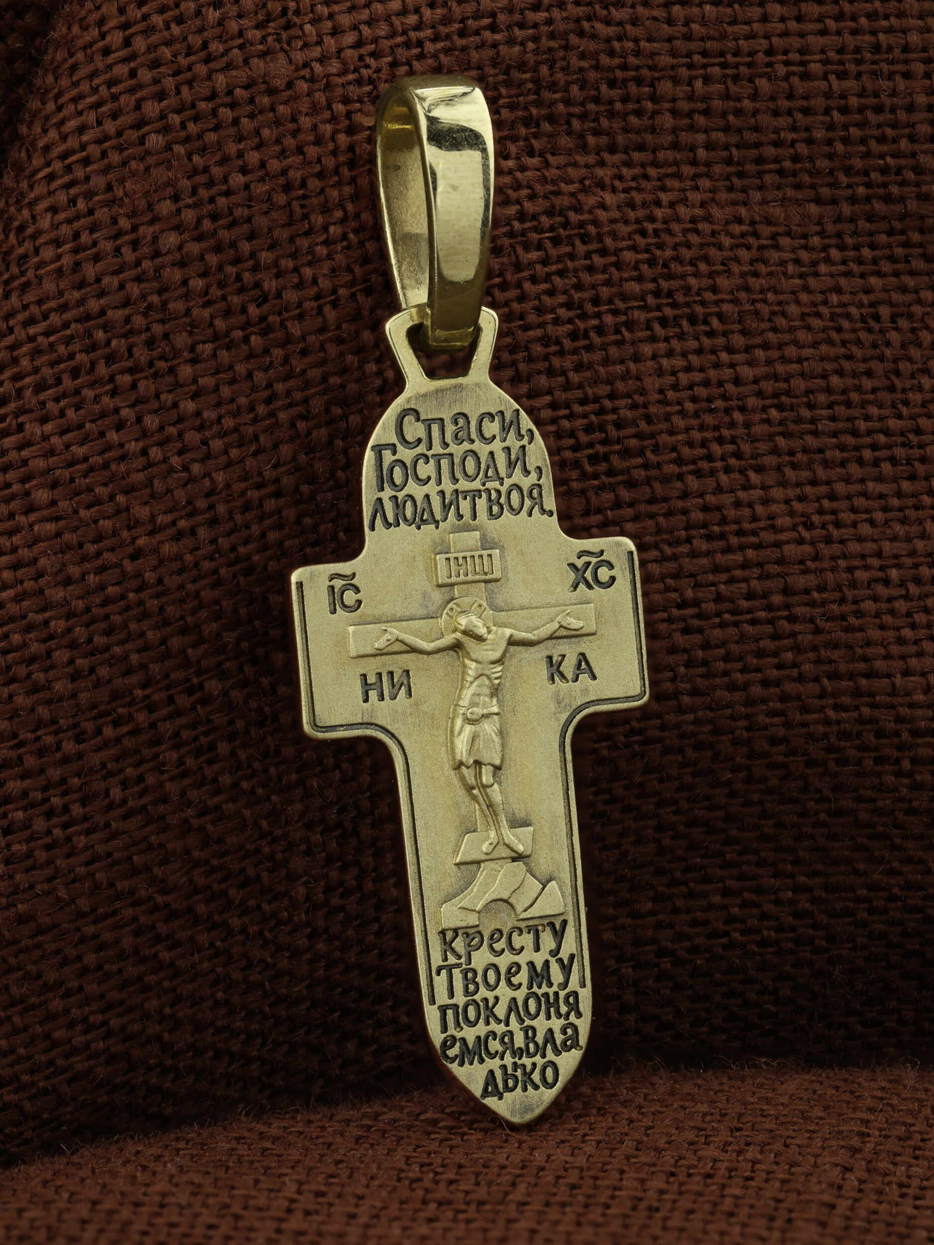 На кресте размещены слова молитвы: «Спаси, Господи, люди твоя» и «Кресту Твоему поклоняемся, Владыко».